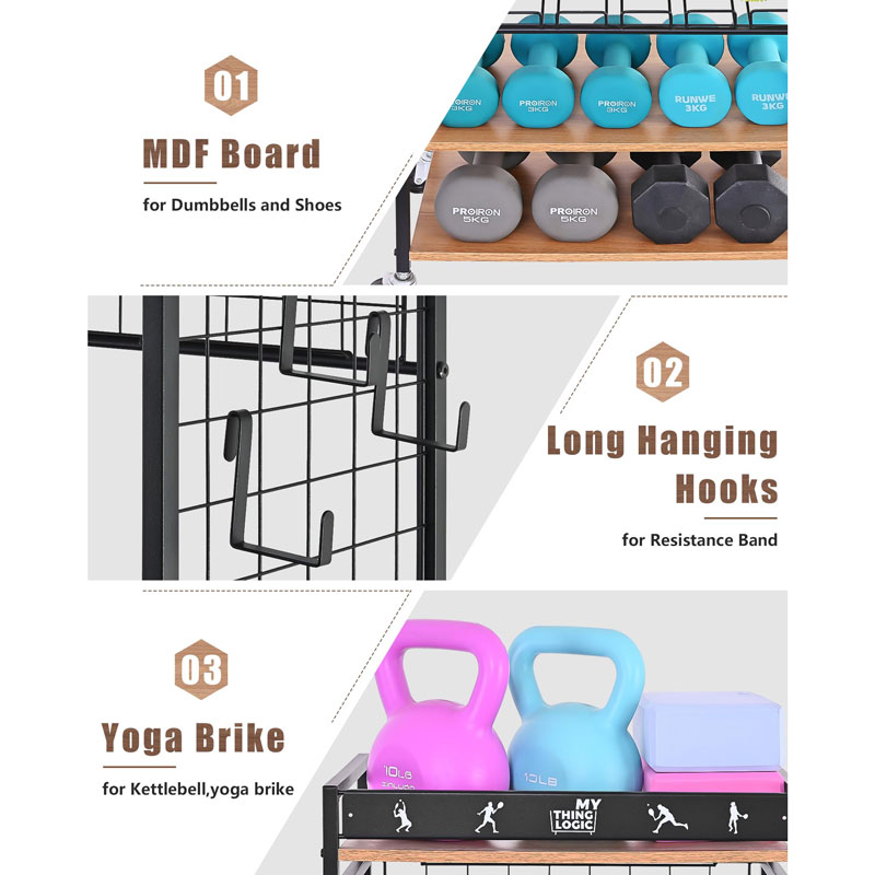 Этот стеллаж для хранения является обновленной версией, которая оснащена не только 3 слоями металлической сетки, боковой корзиной, 3-секционным железным держателем для различных тренажеров и оборудования для упражнений, но и дополнительной вешалкой из оксфордской ткани для полотенец для тренажерного зала.