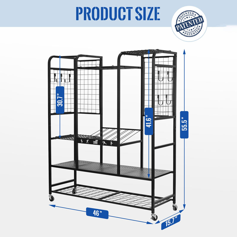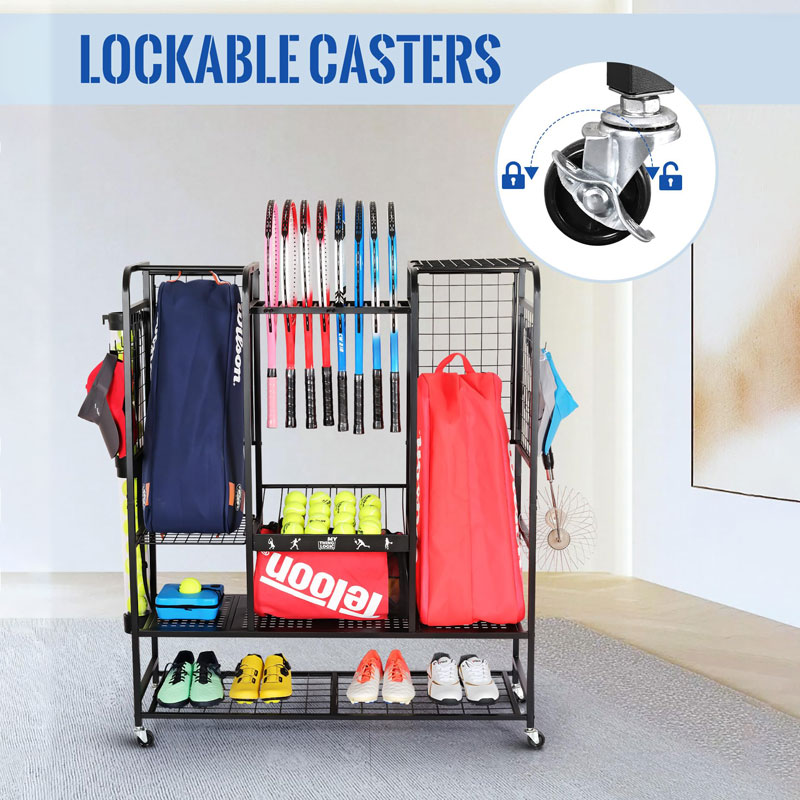 Этот органайзер для теннисного снаряжения имеет несколько полок, боковые крючки и специальные держатели, идеально подходящие для хранения ракеток, мячей, обуви и сумок в одном месте.