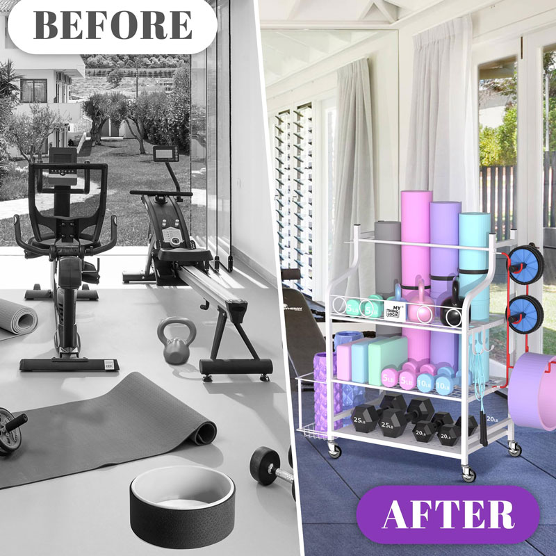 Этот органайзер для хранения тренировочного инвентаря поможет вам хранить коврик для йоги, гантели, гири, кирпич для йоги, резиновые ленты, роликовые колеса, поролоновые валики и т. д. Идеально подходит для любителей йоги.