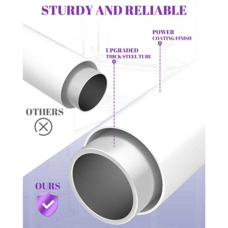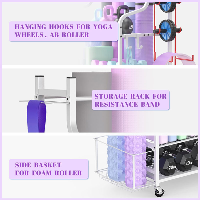 Стойка для хранения оснащена 3 слоями металлической сетки, боковой корзиной, 3-секционным железным держателем и несколькими подвесными крючками, на которых можно хранить различные принадлежности для йоги и тренажеры.