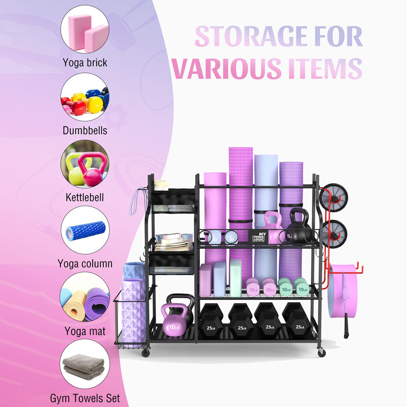 Эта домашняя стойка для хранения спортивного оборудования поможет вам хранить коврик для йоги, гантели, гири, кирпич для йоги, резиновые ленты, роликовый диск, поролоновый валик и т. д., а также полотенце для тренажерного зала. Все необходимое для тренировок в одном месте.