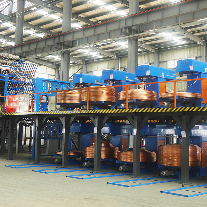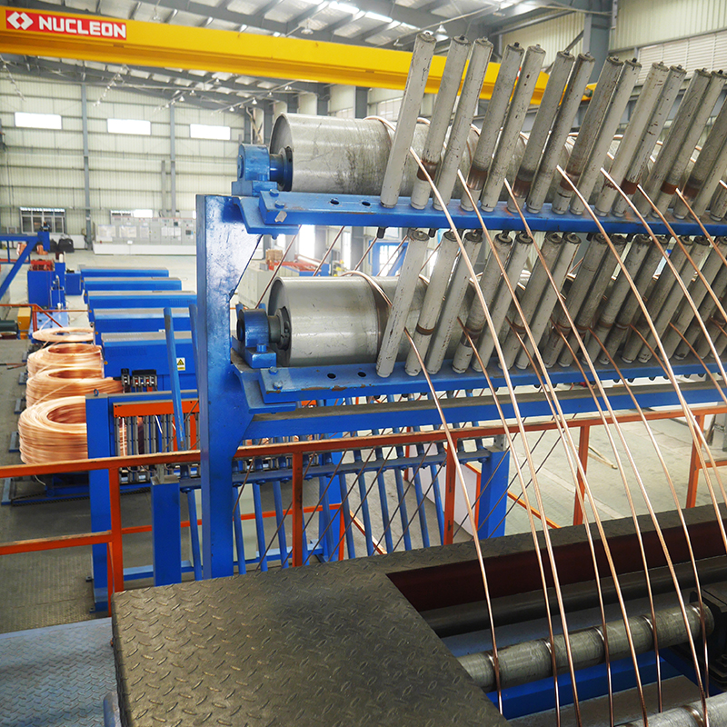 Поместите медный катод в печь с помощью подъемной системы для запекания → отрегулируйте скорость подачи в соответствии со скоростью литья. Подать медный катод в плавильную печь для плавления (уголь должен быть использован для предотвращения окисления) → медная жидкость течет в переходную часть (уголь все еще необходим для предотвращения окисления) → медная жидкость течет в печь удержания → медная жидкость течет в кристаллизатор для получения медных стержней → медные стержни входят в тяговое устройство для движения вверх → проходят через выходную раму → медные стержни проходят через распределительную раму (для разделения каждого стержня) → медные стержни проходят через натяжную раму (для контроля скорости взятия скорость подъема) → медные стержни проходят через машину подъема, для намотки → Следующий процесс