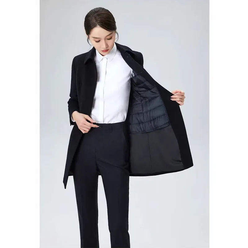 Цвет — глубокий, классический темно-синий, отличающийся от монотонности чистого черного. При освещении он раскрывает богатые оттенки, излучая сдержанную, но утонченную ауру спокойной роскоши. Что касается кроя, то на изображениях видны плавные, элегантные линии. Классический лацкан и однобортный дизайн создают простоту и величие, а вытачки на талии тонко подчеркивают женский силуэт, достигая баланса между лестным кроем и изящной осанкой. Детали, такие как декоративные пуговицы на манжетах, еще больше подчеркивают общую утонченность.