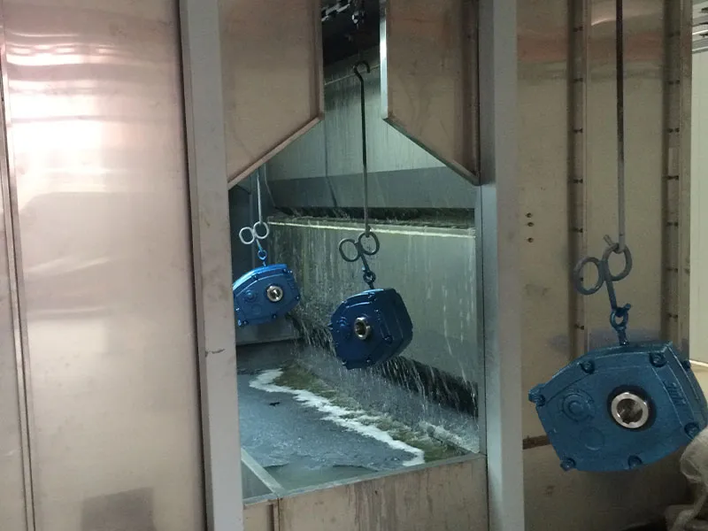 Водооборот водяной завесы осуществляется под действием водяного насоса: вода из резервуара перекачивается в переливной лоток в верхней части шкафа водяной завесы, переливается и образует равномерную водяную пленку толщиной приблизительно 3-5 мм на нержавеющей наклонной пластине, которая улавливает избыточный лакокрасочный туман, ударяющий из зоны окраски. Перед тем как водяная пленка попадает в резервуар, из-за определенной высоты между наклонной пластиной и уровнем жидкости в резервуаре, в пределах этой высоты формируется водяная завеса. Когда избыточный лакокрасочный туман под действием воздушного потока проходит через эту водяную завесу, он фильтруется ею. Кроме того, ответвление циркуляционного трубопровода оснащено распылительным устройством перед сепаратором «газ-вода», обеспечивая дополнительную фильтрацию отработанных газов. Вода, содержащая частицы краски, перед фильтрующей сеткой контактирует с коагулянтом, высвобождаемым в резервуаре, который со временем можно заменять; остальная вода под действием насоса продолжает непрерывно циркулировать.