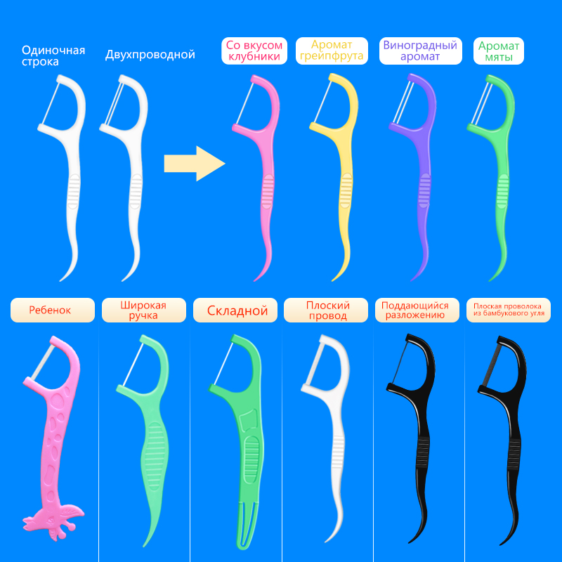 Зубная нить высокого натяжения плавно скользит, она прочная, ее нелегко сломать или распушить. Она тщательно очищает каждый зуб и полностью заботится о вашей полости рта.Нескользящая ручка имеет эргономичный дизайн, что делает ее более удобной в удержании, эксплуатации и экономит время на очистке.Один конец зубочистки изогнут и предназначен для удаления стойких остатков, что позволяет легко обрабатывать различные формы межзубных промежутков.