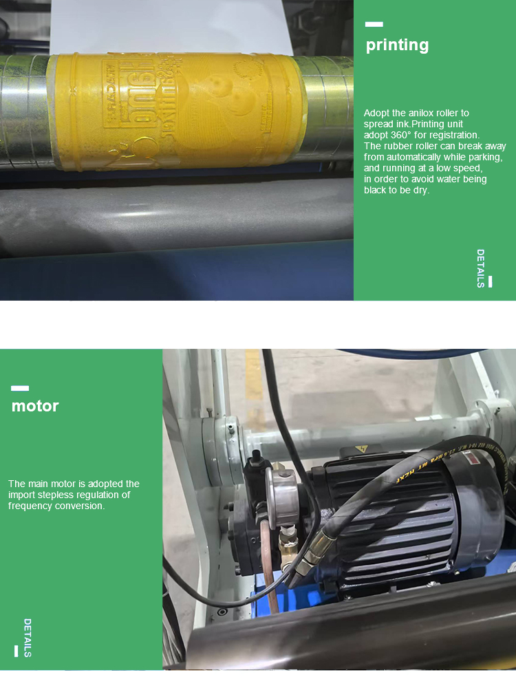 Каждая печатная секция оснащена инфракрасной системой сушки. Резиновый валик автоматически отводится от печатной поверхности при остановке машины и работает на низкой скорости, предотвращая высыхание водных красок. Главный привод оснащён импортной системой плавного регулирования скорости с частотным преобразователем.