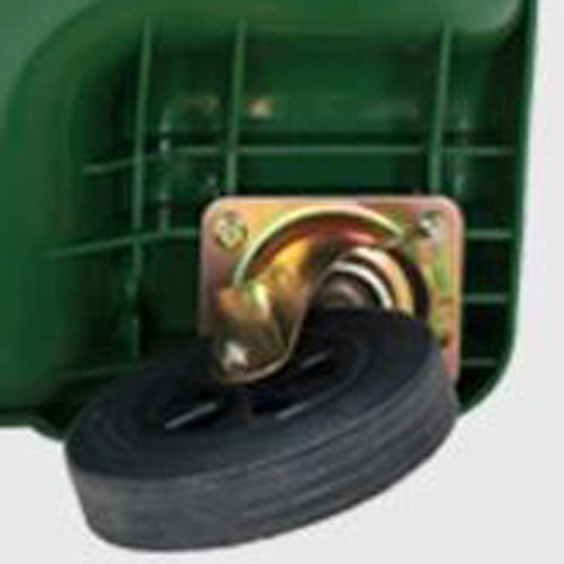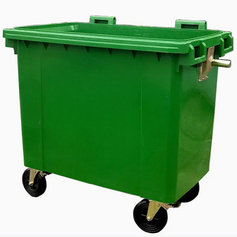Технические параметры: вместимость 660 л; внешние размеры 125 см * ширина 76 см * высота 120 см; основной материал полиэтилен высокой плотности HDPE; ролики, два направленных колеса и два универсальных колеса.