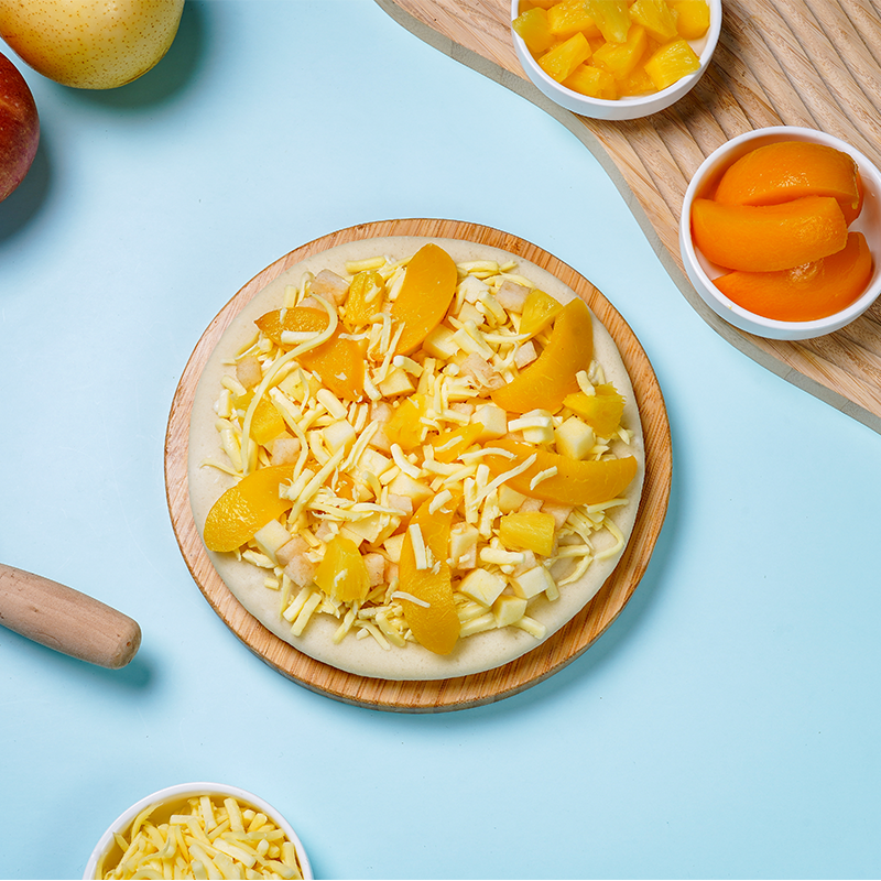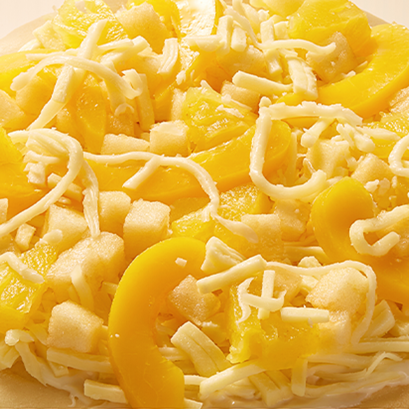 Состав: Пшеничная мука, жёлтый персик, яблоко, груша, ананас, тёртый сыр моцарелла (сырный продукт), питьевая вода, майонез, растительное масло, кулинарный жир, сухое цельное молоко, дрожжи, сахар, соль, витамин С, стевиолгликозиды
