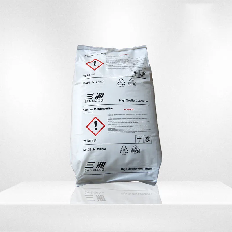 Пиросульфит натрия упаковывается в двойную тару: внутренняя упаковка — полиэтиленовый мешок пищевого класса, внешняя упаковка — полипропиленовый тканый мешок. Вес мешка: 25 кг, 50 кг, 1000 кг. На упаковке напечатаны слова «Пищевая добавка Пиросульфит натрия» и маркировка «Беречь от влаги и тепла», торговая марка — «Сансян».