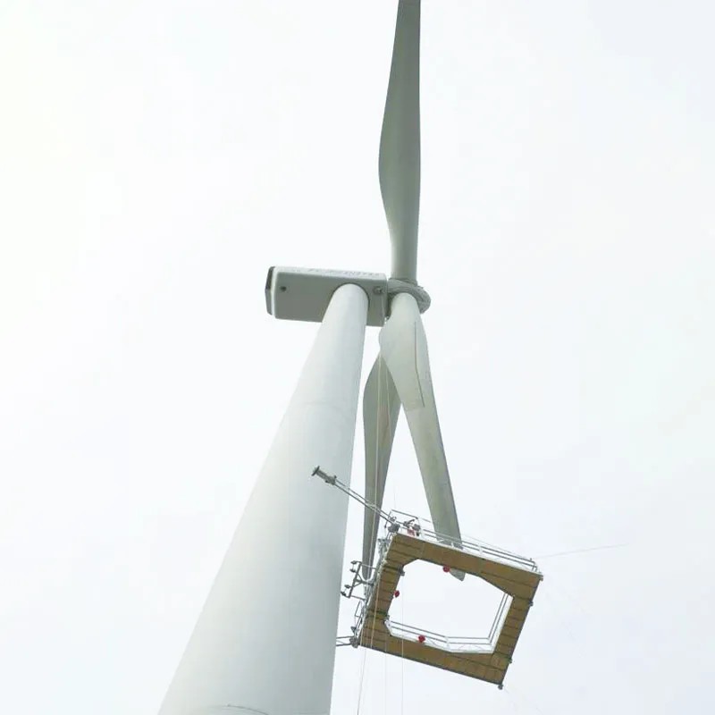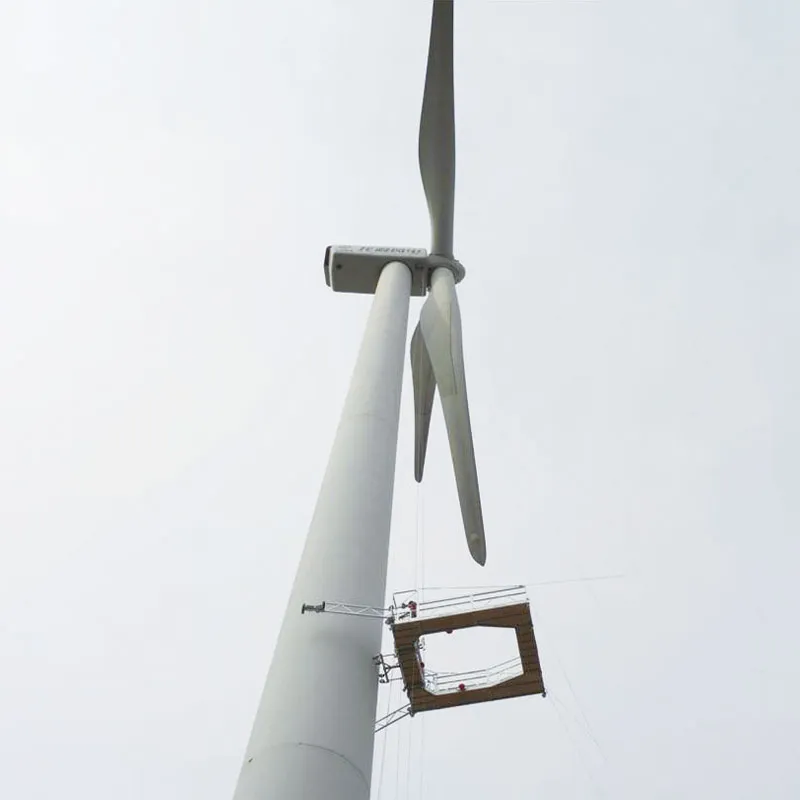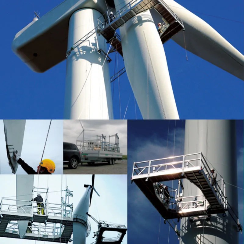 Подвесная платформа с кольцевой конфигурацией для ветроэнергетических установок – специализированная подвесная люлька для обслуживания ветрогенераторов. Научно-исследовательский центр группы компаний постоянно уделяет внимание вопросам высотных работ в ветроэнергетической отрасли. На текущий момент разработано множество высотных рабочих платформ, среди которых особо выделяются крупная рабочая платформа для обслуживания лопастей и окружающая подвесная конструкция. На территории Китая компания, учитывая особенности местных ветроэнергетических парков, разработала компактную подвесную люльку для ветрогенераторов, оснащенную усиленной системой предохранительных замков и поддерживающую напряжение 690 В. При эксплуатации обеспечивает безопасность, маневренность и комфорт. Данное изделие стало надежным помощником для производителей лопастей и операторов ветроэнергетических парков.