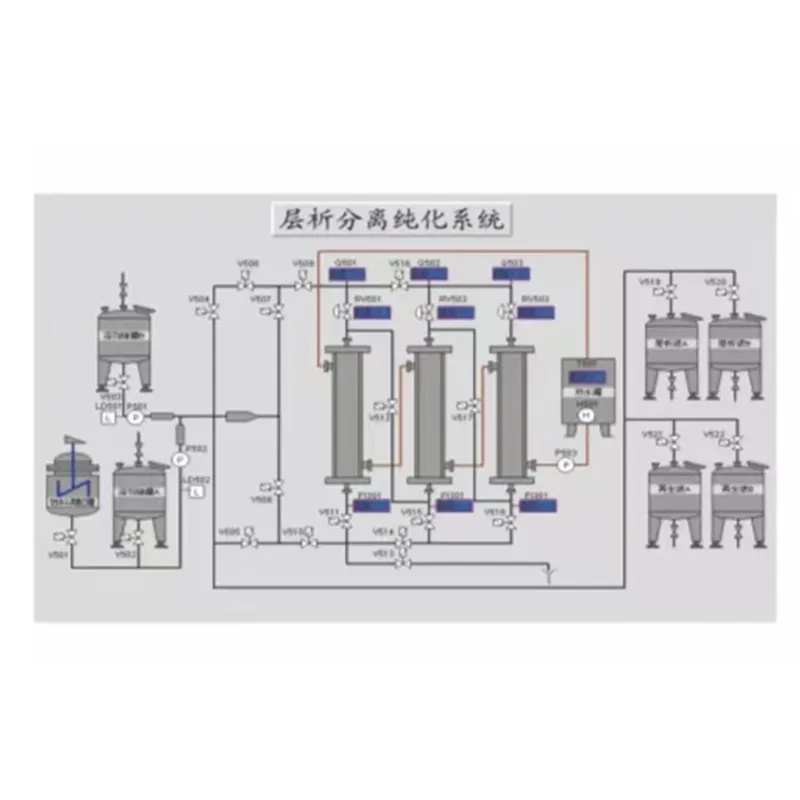 Широко применяется для очистки сточных вод, экстракции и очистки белков, ферментов, моносахаридов, полисахаридов и биологически активных компонентов растений. Особенности хроматографического разделения заключаются в следующем: мягкие условия процесса (комнатная температура, обычно атмосферное давление); возможность одновременного получения нескольких чистых компонентов за один проход смеси; возможность проведения прецизионного разделения с получением продукта высокой чистоты. Данный комплекс интегрирует современные технологии компьютерного автоматизированного управления и онлайн-мониторинга технологических параметров, осуществляя модернизацию и усовершенствование традиционного ручного хроматографического оборудования, повышая надежность и воспроизводимость установки. Оборудование облегчает масштабирование хроматографического процесса, решая задачи промышленного производства.