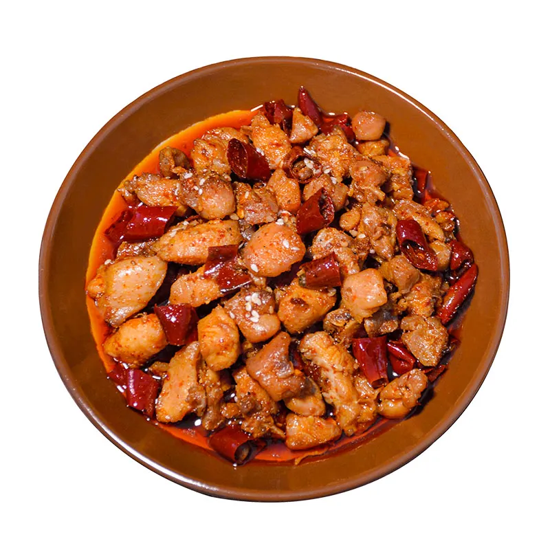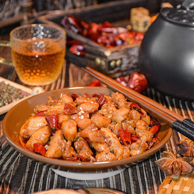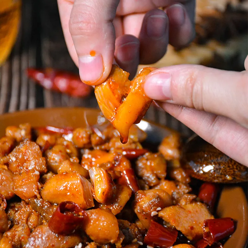 Главная звезда — кролики, выращенные на свободном выгуле в горах Бачжуна. Их мясо плотнее, чем у кроликов в клетках, с ноткой дикой сладости. Свежезабитые и нарезанные на кусочки размером с большой палец, они обеспечивают плотное укус, не будучи ни жесткими, ни ломкими, и отлично впитывают приправу.