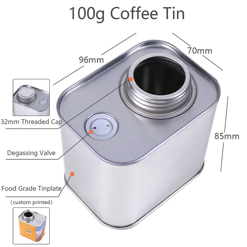 Пользовательские банки для кофейных зерен имеют размер 96*70*85 мм, идеально вмещают 100 г кофейных зерен. Эта квадратная жестяная банка оснащена односторонним дегазационным клапаном для сохранения вкуса и свежести ваших кофейных зерен. Изготовлена из пищевой жести, у нас есть достаточные запасы непечатных заготовок, и мы можем принимать заказы и отгружать в любое время, что исключает необходимость ожидания доставки. Также возможна индивидуальная настройка, на корпус банки можно нанести ваш собственный логотип. Мы принимаем все виды индивидуальных заказов.