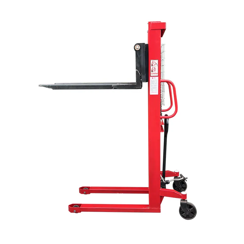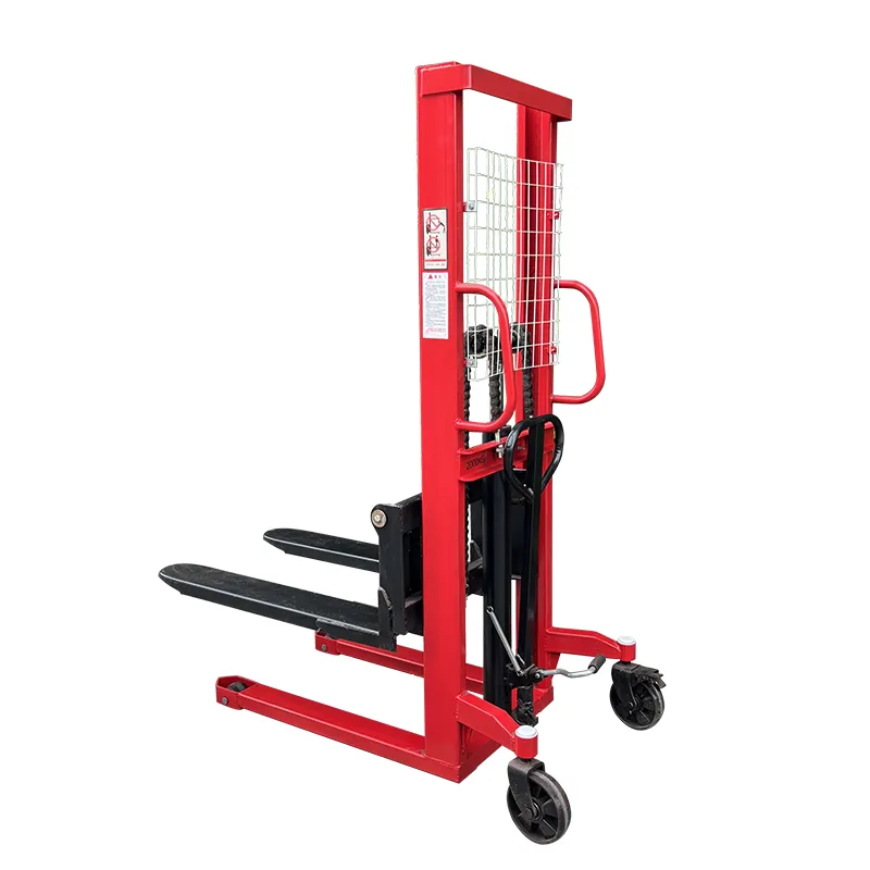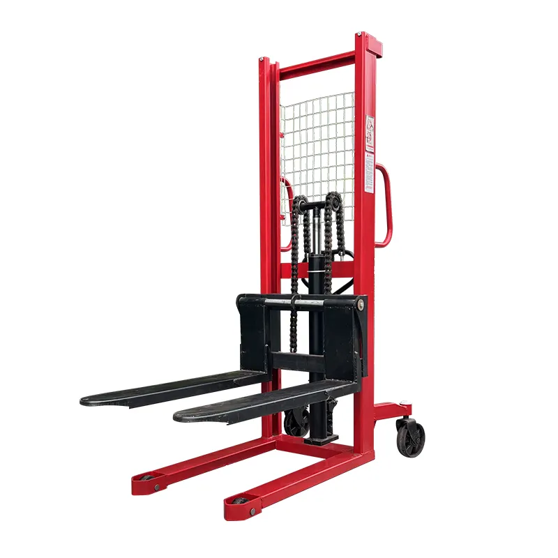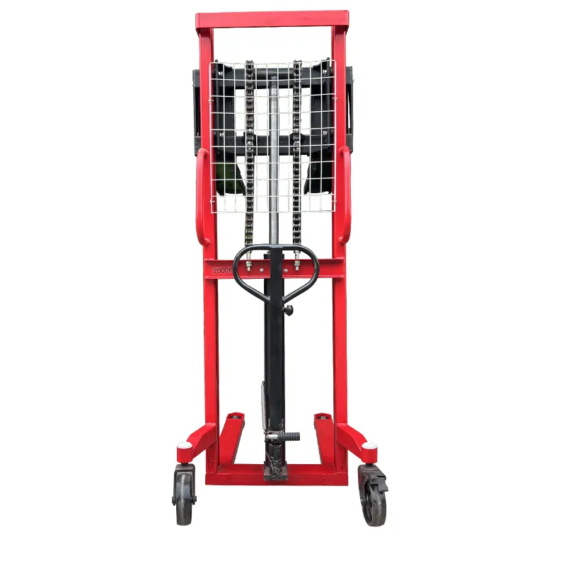 Гидравлический цилиндр через направляющие колеса с обеих сторон рычага приводит в действие усиленную цепь большой тяговой способности, поднимая вилы, утолщенная и удлиненная цепная база обеспечивает устойчивость груза.