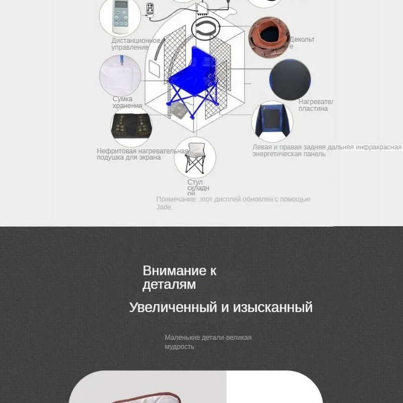 Полный спектр оздоровительных процедур у вас дома или в офисе, нет нужды ходить в фитнес-клуб! Уникальная оздоровительная мини сауна, в которой применяются специальные технологии и свойства лечебных камней (турмалин, нефрит). Улучшает микроциркуляцию и стимулирует метаболизм, нормализациует Инь и Ян, помогает похудению, выводит из организма токсины, регулирует нервную систему, снимает болевые ощущения, оказывает противовоспалительное действие и косметологический эффект, снимает усталость, улучшает качество сна.Важно! Не путайте нашу мини сауну с паровыми саунами или саунами с парогенераторами. Наша мини сауна имеет в комплекте лечебные камни, выделяющие, помимо сухого пара и теплового эффекта, инфракрасное излучение и биоэнергетическое волны, оказывающие оздоровительные процедуры на весь организм.Прежде чем познакомиться детально с мини сауной «Ба-Гуа», давайте прежде вспомним, что нам известно про оздоровительные камни! Полезные свойства оздоровительной мини сауны «Ба-Гуа»: 1)Глубинный вывод токсинов Токсины, как поступившие в организм извне, так и накопившиеся в нём, не могут не вызвать нарушение функционирования органов и клеток, не могут не затруднить кровообращение, нарушить баланс Инь и Ян, дестабилизировать секрецию. Токсины – это причина многих хронических заболеваний! Чистка организма через потоотделение – это один из важнейших способов детоксикации, и именно с этим больше всего трудностей у современного человека. Разогретый турмалин способен оказывать на организм глубинное шлаковыводящее воздействие. Он выведет все нечистоты, что накопились в клетках, удалит из тела всю грязь – «промоет» организм с головы до пят!