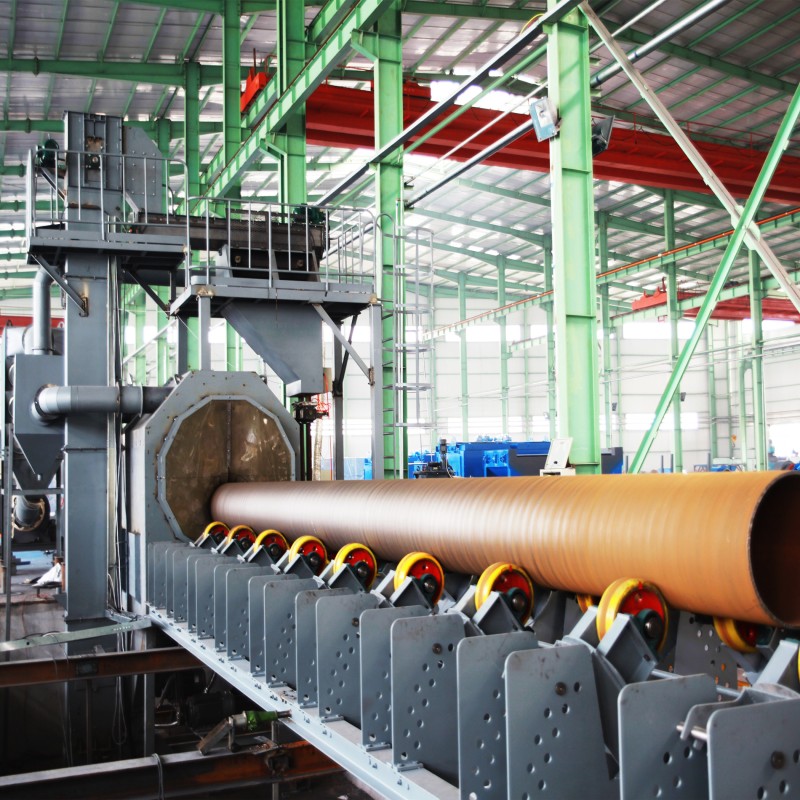 B. Что касается стальной трубы диаметром Φ159-Φ2800 мм, мы принимаем роликовый конвейер, угол между роликами регулируется, скорость движения и скорость вращения можно регулировать с большим диаметром; абразивный диск принимает нижнее распределение абразива, эффективность очистки высока, результат хороший.