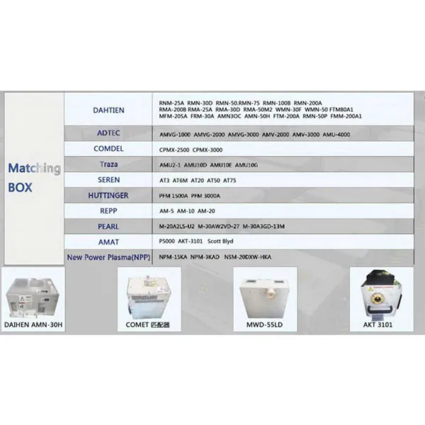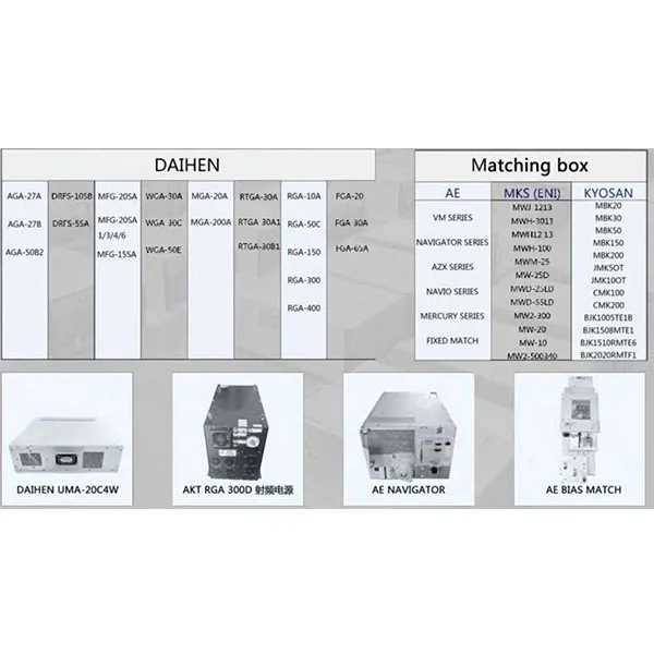 Новые изделия RF generator относятся к совершенно новым продуктам генераторов радиочастоты, эти продукты используются для подачи радиочастотной мощности в оборудовании для производства полупроводников. Они обладают передовыми технологиями и эффективной способностью вывода мощности. Подержанные изделия относятся к уже использовавшимся генераторам радиочастоты, которые после проверки и тестирования могут быть проданы повторно. Услуги по ремонту RF generator представляют собой услуги по ремонту и техническому обслуживанию уже использовавшихся генераторов радиочастоты. В процессе ремонта могут проводиться диагностика неисправностей, замена поврежденных компонентов, повторная калибровка и другие операции для восстановления нормальной работы оборудования, при этом осуществляется сотрудничество с брендами AE, MKS/ENI, COMDEL/KYOSAN, DAIHEN и согласующими устройствами, а также с услугами по ремонту источников питания постоянного тока.