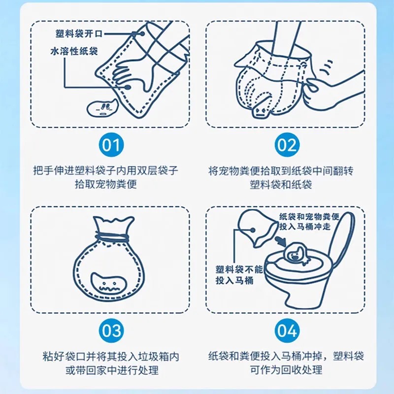 Это пакеты с рифлёным краем для уборки за животными, которые решают проблему сложного раскрытия из-за сухости рук. Данные двухслойные усиленные пакеты отличаются большим размером и удобством в использовании, эффективно изолируют неприятные запахи. Являются незаменимым аксессуаром для выгула собак, делая процесс уборки простым и комфортным. Конструкция продукта состоит из слоя бумаги и слоя пластика: бумажный слой выполнен из водорастворимой бумаги, которая быстро растворяется в воде и является смываемой, а пластиковый слой производится из биоразлагаемого материала, что обеспечивает экологическую безопасность.