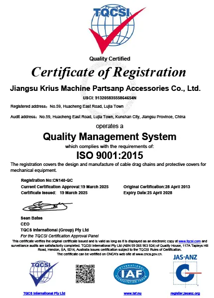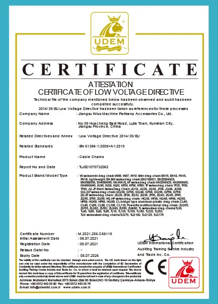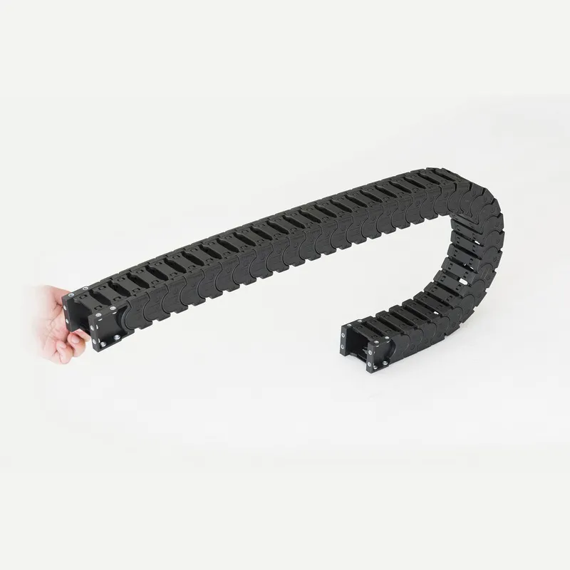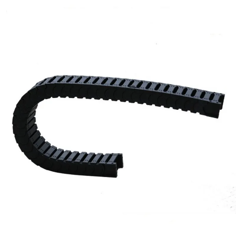 Используются материалы с низким коэффициентом трения (например, модифицированный полиамид 66 + стекловолокно, самосмазывающийся полиоксиметилен) в сочетании с малым шагом цепи (длина звена ≤30 мм) для уменьшения площади трения. Уровень рабочего шума контролируется на уровне 35–45 дБ(А) (что эквивалентно шуму в повседневной офисной обстановке, значительно ниже 60–70 дБ(А) обычных кабельных цепей) благодаря резиновым прокладкам или бесшумным пряжкам между звеньями цепи.
