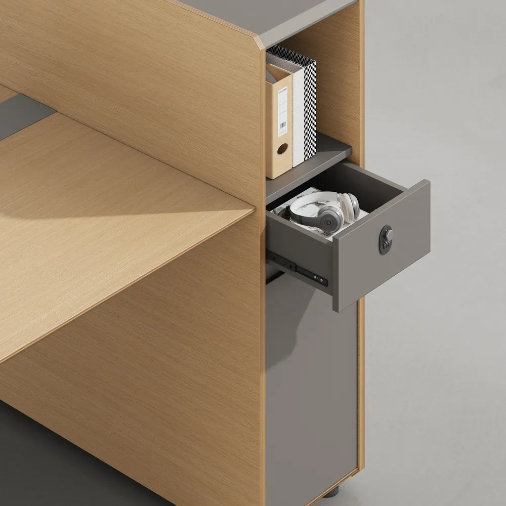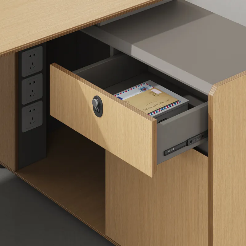 Комплектация: скрытые направляющие, дверные петли с демпфером, многофункциональный кабельный органайзер, цифровой кодовый замок, настольная перегородка со стальным каркасом и тканевой панелью, стальной кабельный канал.