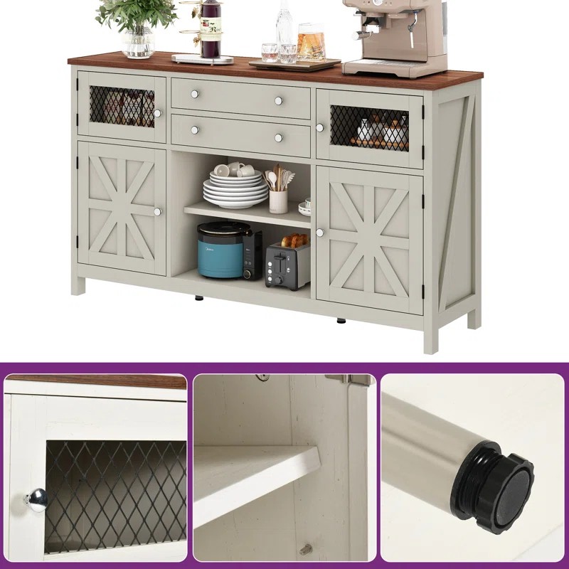 УВЕЛИЧЬТЕ ПРОСТРАНСТВО ДЛЯ ХРАНЕНИЯ: в нашем шкафу для кофе есть 8 полок и верхняя часть шириной 59 дюймов, где вы можете разместить кофеварку, микроволновую печь или выпечку. Регулируемые полки вместят громоздкие или высокие предметы, а два ящика спрячут столовые приборы. Сетчатая дверца позволяет легко доставать предметы.