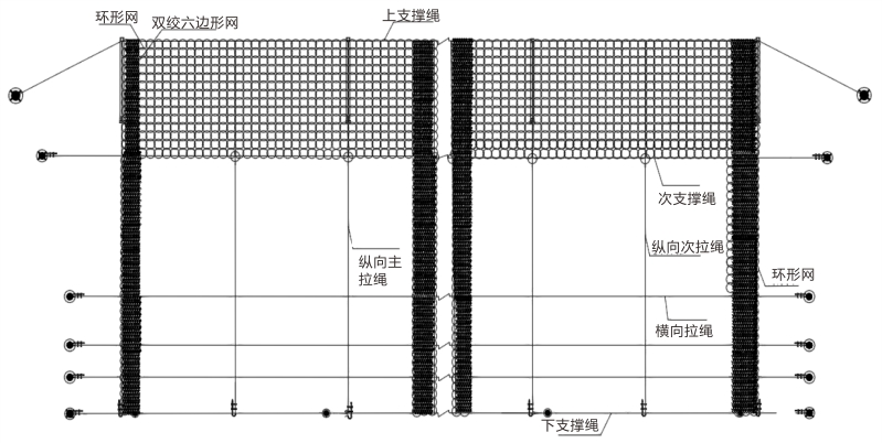 Состоит из стальных колонн, металлической сетки, тросов, анкеров, креплений и т.д.