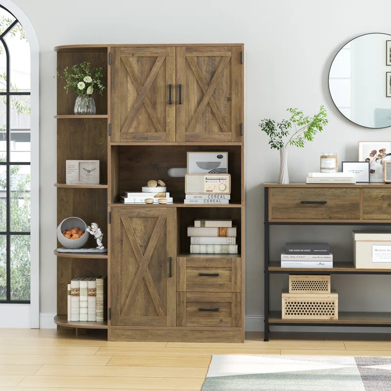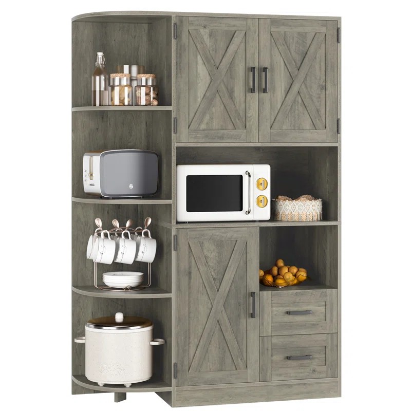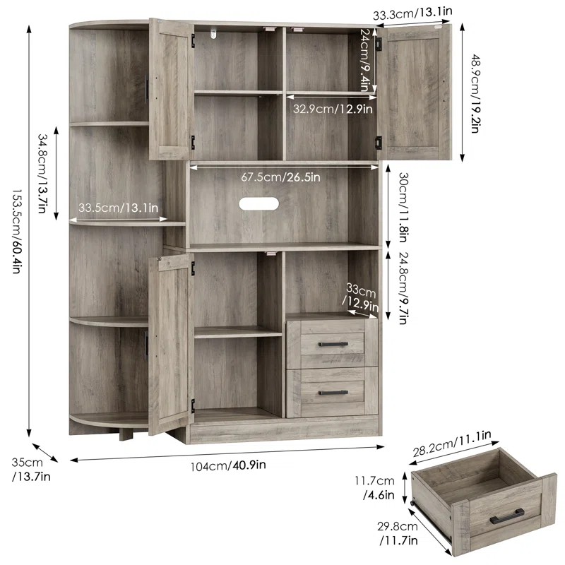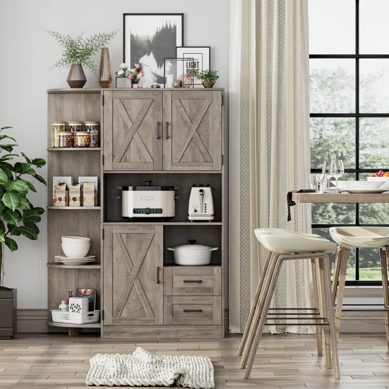 УЛУЧШИТЕ ХРАНЕНИЕ НА КУХНЕ: этот универсальный сервант оснащен вместительными отделениями, тремя шкафами, каждый из которых оснащен регулируемыми полками, четырехъярусной внешней полкой и двумя легко выдвижными ящиками. Здесь предусмотрены как открытые, так и скрытые пространства для удобной организации всех кухонных приборов и принадлежностей для приготовления пищи.