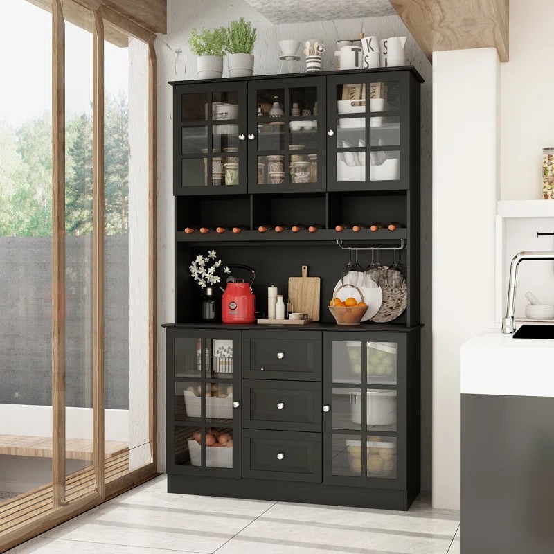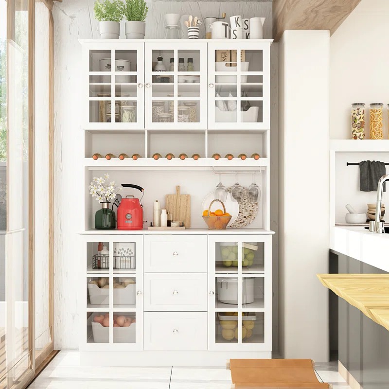 УЛУЧШИТЕ ХРАНЕНИЕ НА КУХНЕ: этот универсальный сервант оснащен вместительными отделениями, тремя шкафами, каждый из которых оснащен регулируемыми полками, четырехъярусной внешней полкой и двумя легко выдвижными ящиками. Здесь предусмотрены как открытые, так и скрытые пространства для удобной организации всех кухонных приборов и принадлежностей для приготовления пищи.