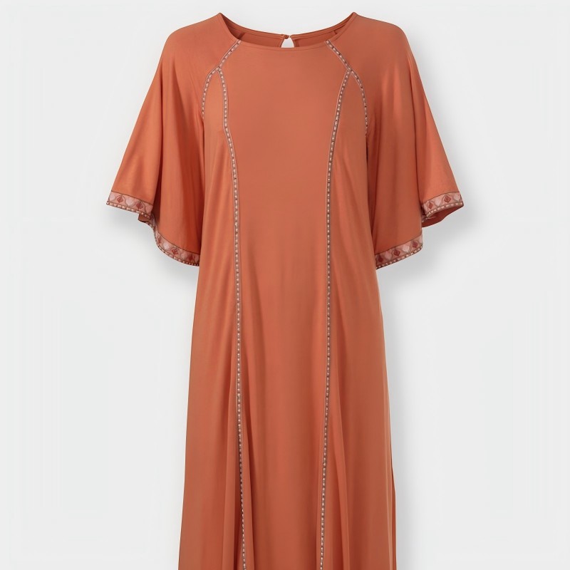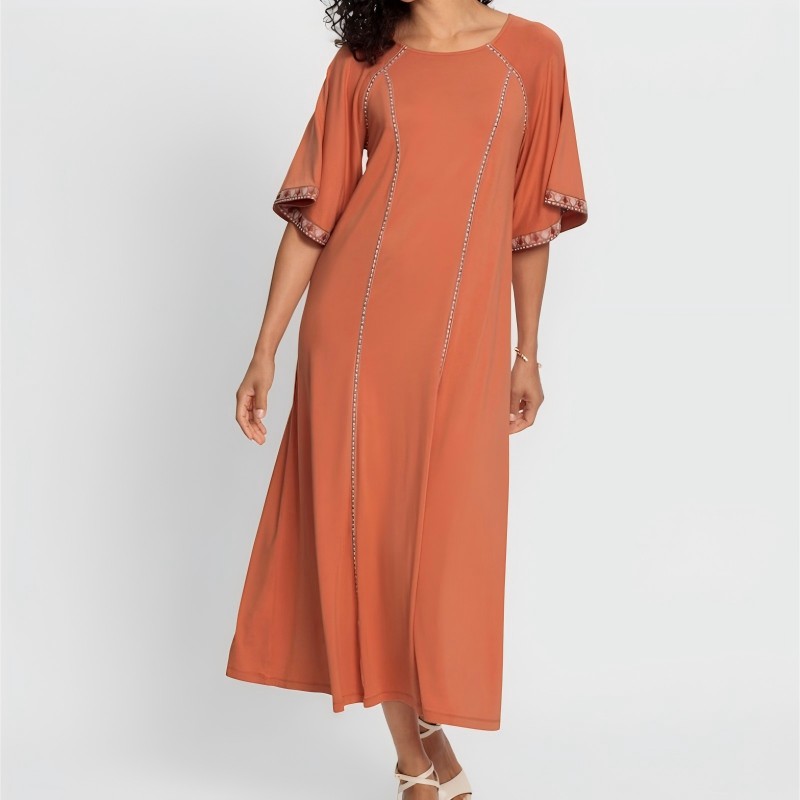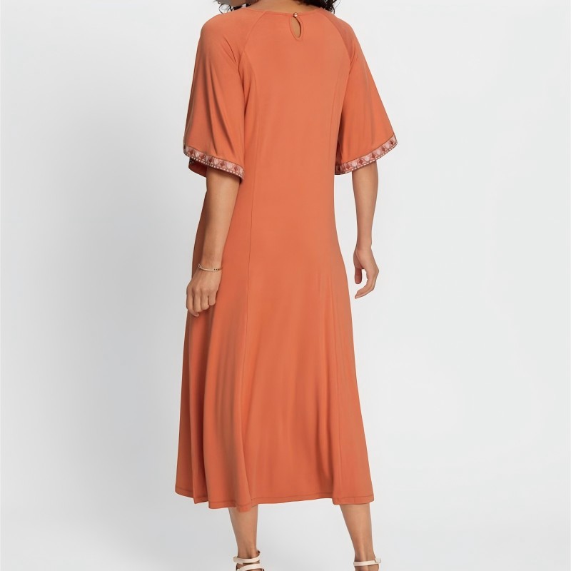 Это платье, сшитое из струящейся смеси вискозы и эластана, мягко облегает фигуру и повторяет ваши движения. Изысканный А-образный силуэт подчеркивает талию и плавно ниспадает до длины ниже колена, обеспечивая универсальную посадку, которая подходит практически любой фигуре. Тонкий вышитый шов проходит вертикально от выреза до подола, создавая чистую, непрерывную линию. Вырез на спине застегивается на одну пуговицу, а расклешенные рукава длиной до локтя повторяют легкий объем юбки — каждый манжет украшен тонкой вышивкой, создавая гармоничный и элегантный образ. Универсальное и элегантно скроенное, оно идеально подходит как для дневных, так и для вечерних мероприятий.