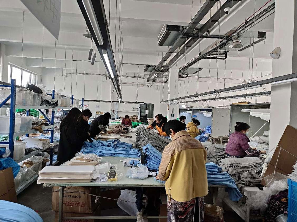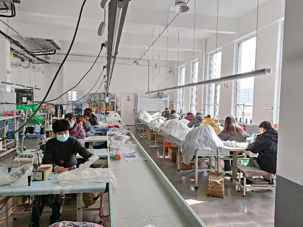 Наша рабочая сила превышает 150 квалифицированных специалистов: 1. Торговый отдел — 6 сотрудников 2. Дизайнерский отдел — 5 сотрудников 3. Образцовая комната — 5 сотрудников 4. Раскройный цех — 12 сотрудников 5. Швейный цех — 120 сотрудников, на каждой линии по 20 сотрудников 6. Упаковочный цех — 15 сотрудников 7. Отдел контроля качества — 12 сотрудников