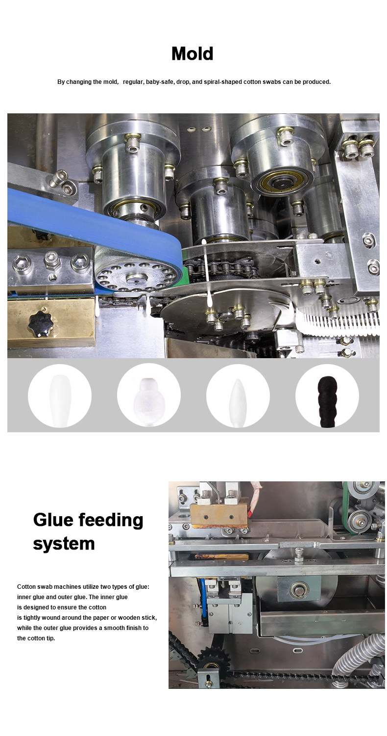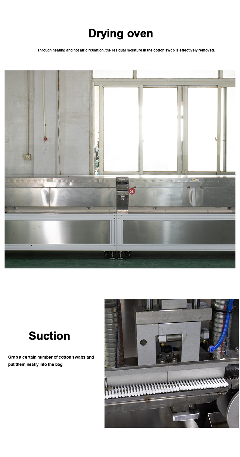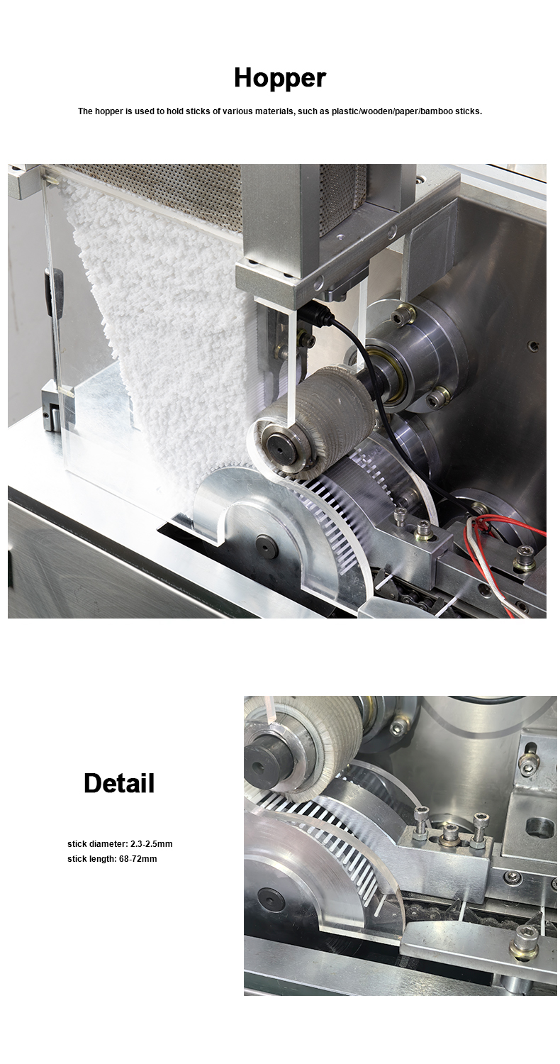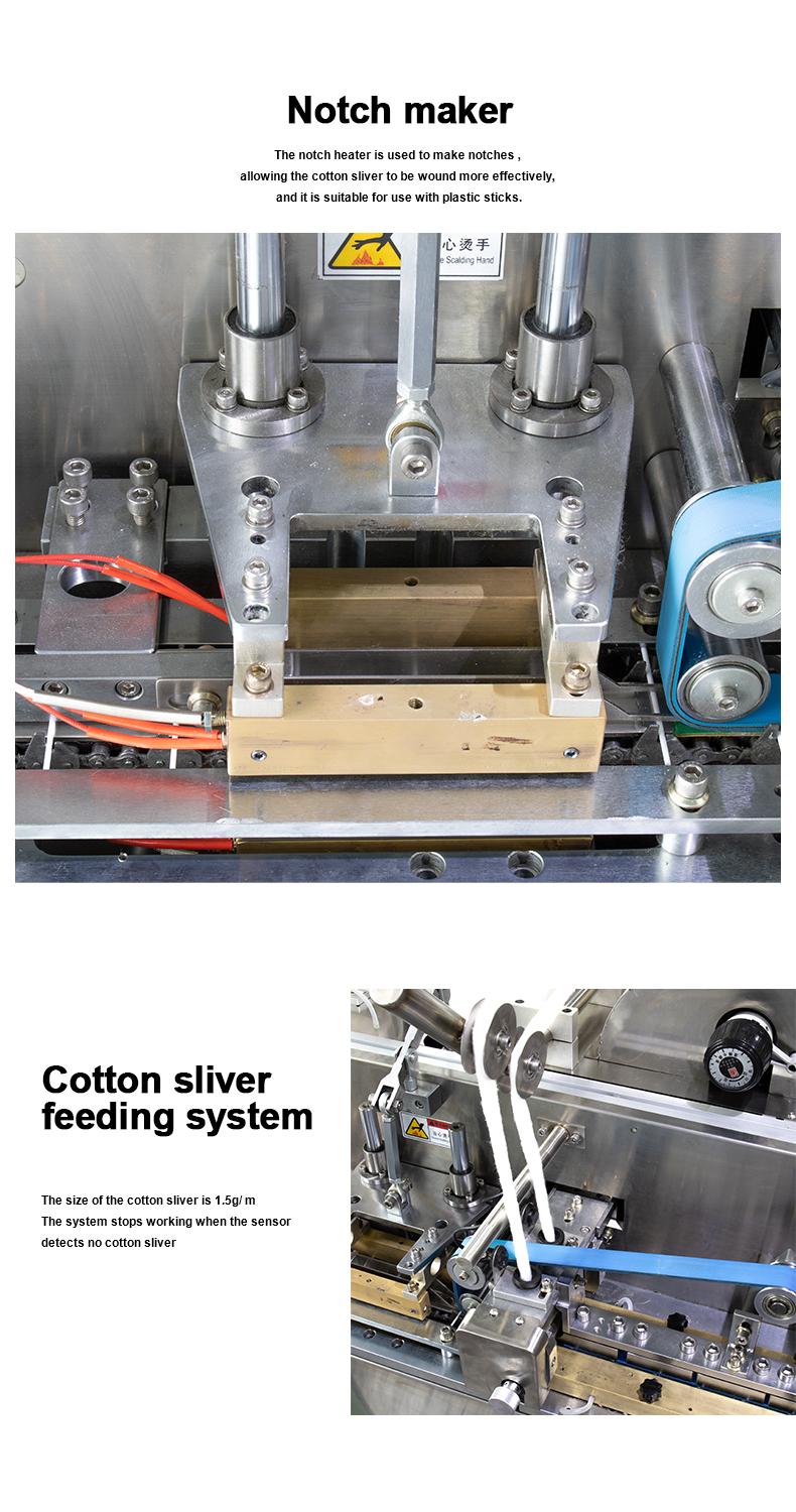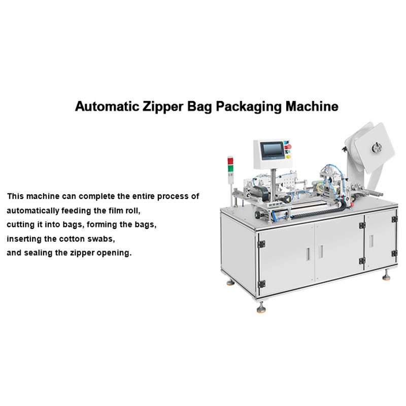 Данный станок выполняет полный цикл операций: автоматическую подачу рулона плёнки, нарезку её на пакеты, формирование пакетов, автоматическую укладку ватных палочек и герметичное запаивание застёжки пакета.