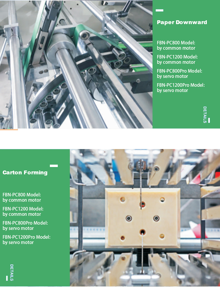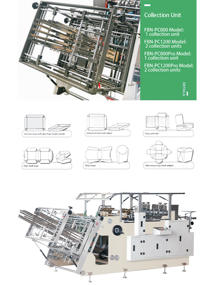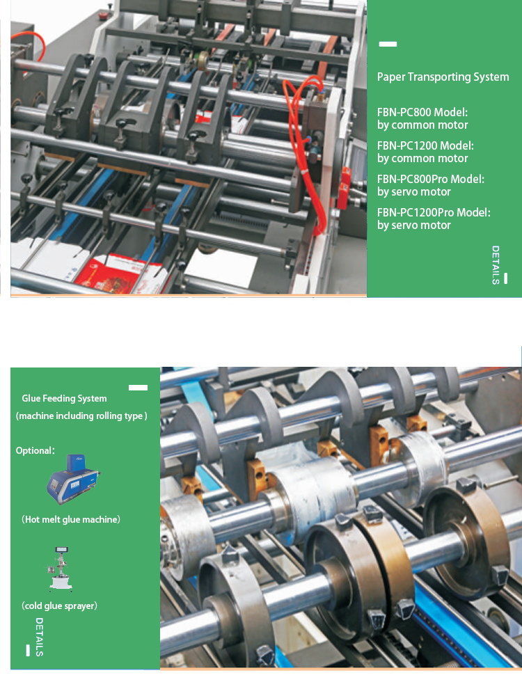 Оборудование оснащено микрокомпьютером, системой управления ПЛК, сервоприводной подачей, частотным преобразователем для регулировки скорости, системой вакуумного захвата, автоматическим нанесением клея, автоматическим счётчиком бумажной ленты и цепным приводом.