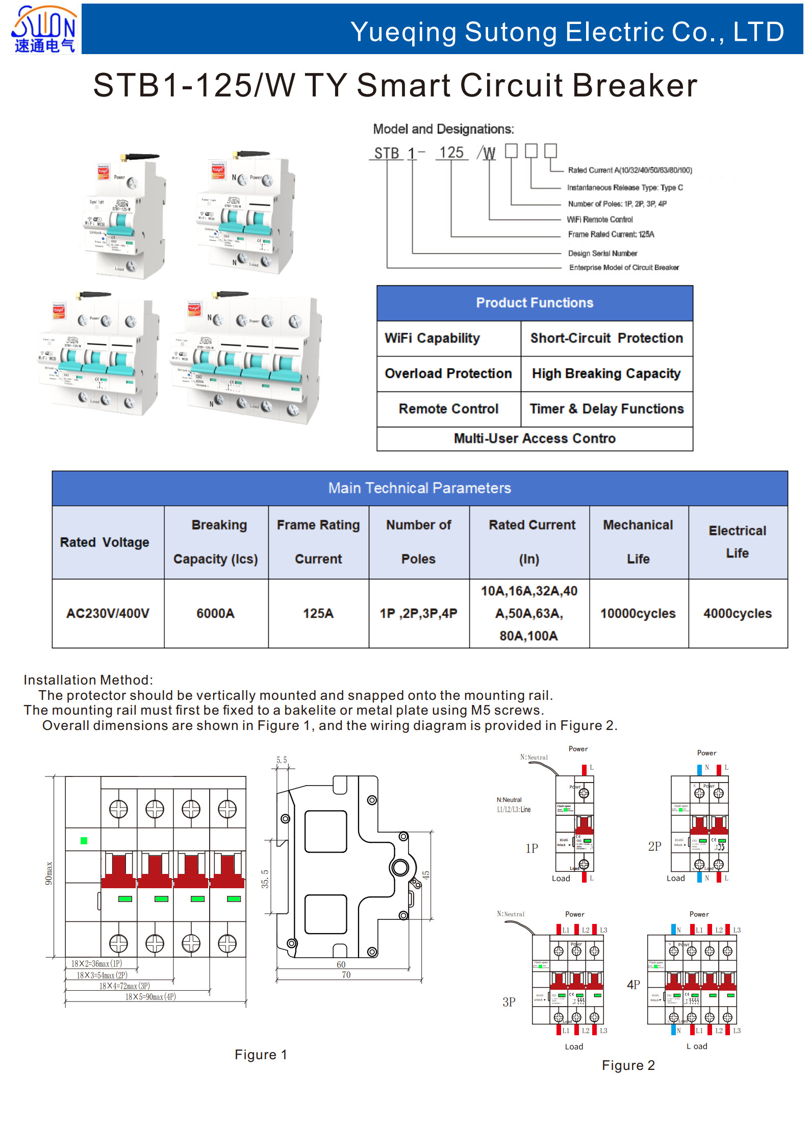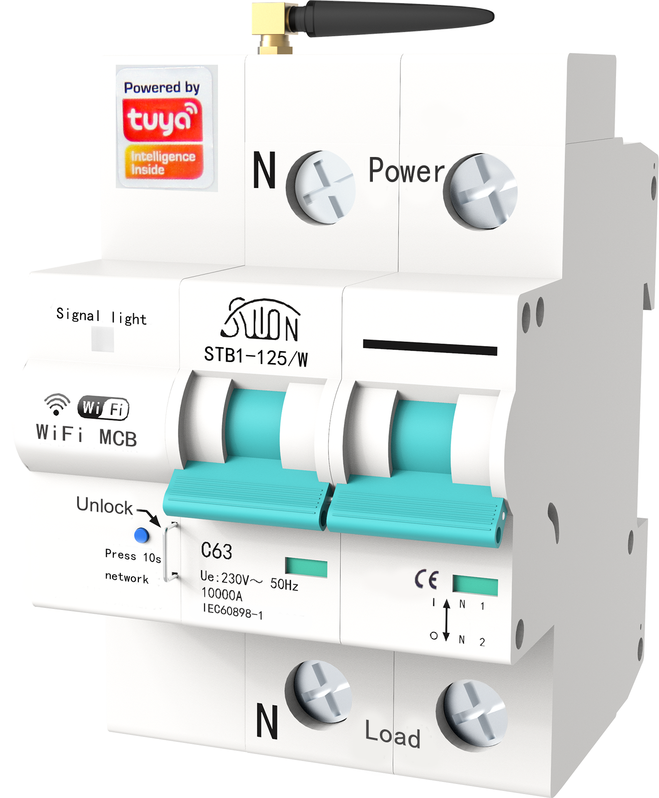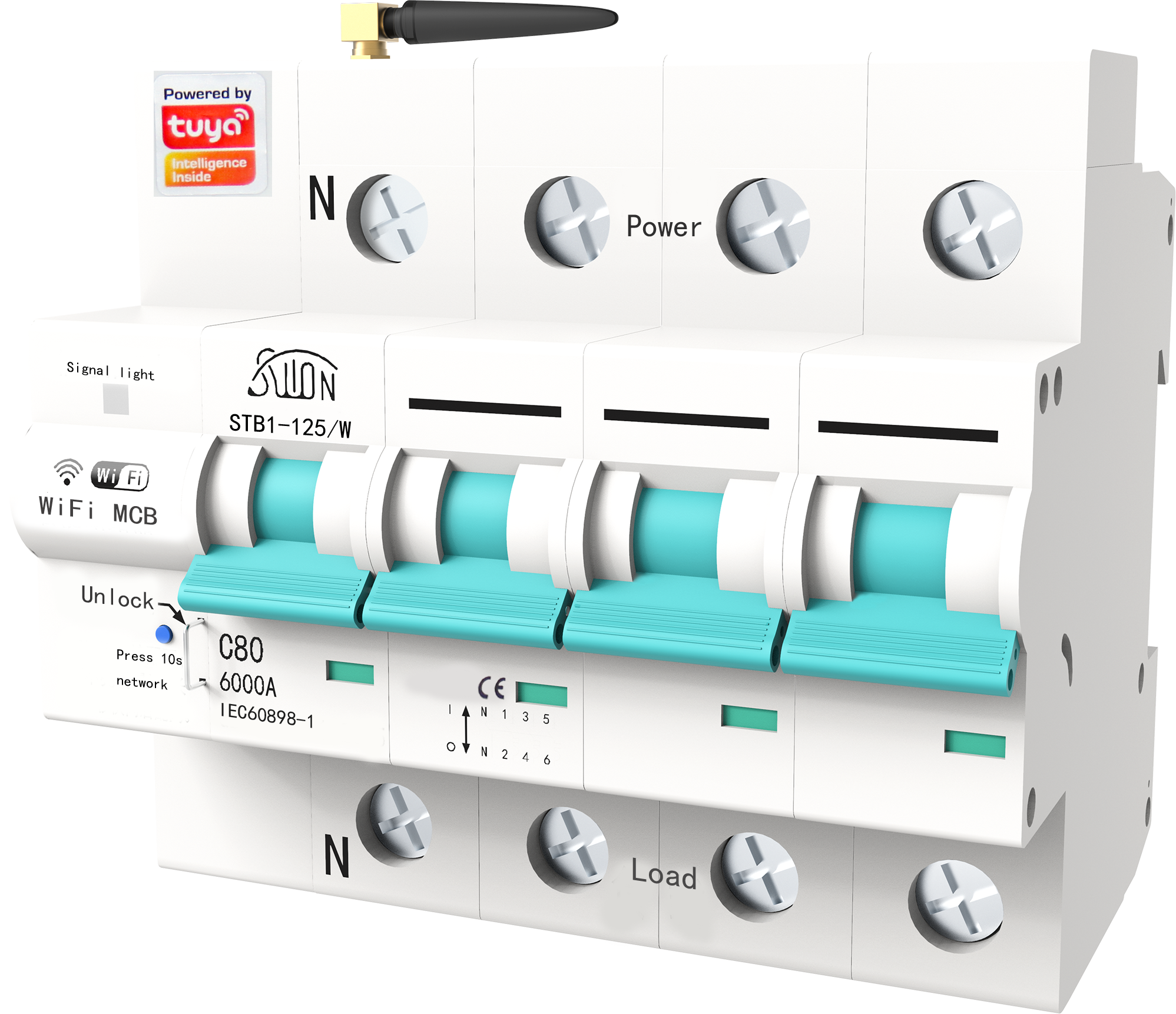 STB1-125/W智能断路器适用于交流50Hz,额定工作电压230/400V,额定工 作电流100A及以下的用户或负载中,具有过载及短路保护功能,手机远程控制断路器分合闸,手机实时显示断路器分合闸状态、定时、 延时多人分享控制,外形美观、性能优良可靠,分断能力较高,脱扣迅 速,模数化导轨式安装。 主要用于家庭、学校、医院、商场、办公楼、灌溉、农场、抽水 泵、出租房等用电设备的远程控制。