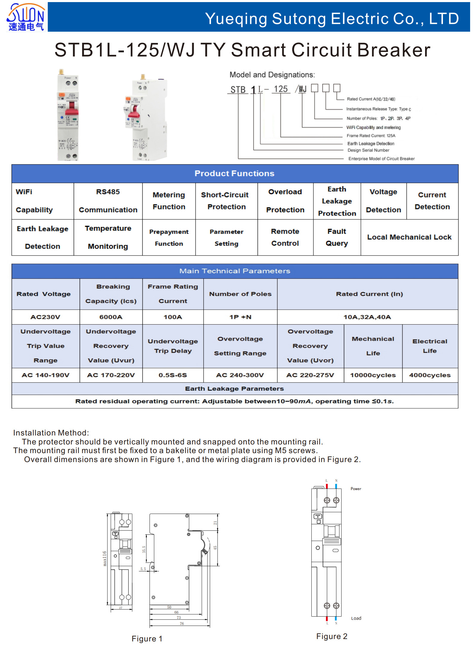 STB1L-125/WJ智能断路器适用于交流50/60Hz,额定工作电压230V,额定工作电流40A及以下的用户或负载 中,当线路中出现过欠压(设定过欠压)时对用电设备进行保护;同时具有过载及短路保护功能,外形美观、性能 优良可靠,分断能力较高,脱扣迅速,可实现远程控制,产品模数化导轨式安装。
