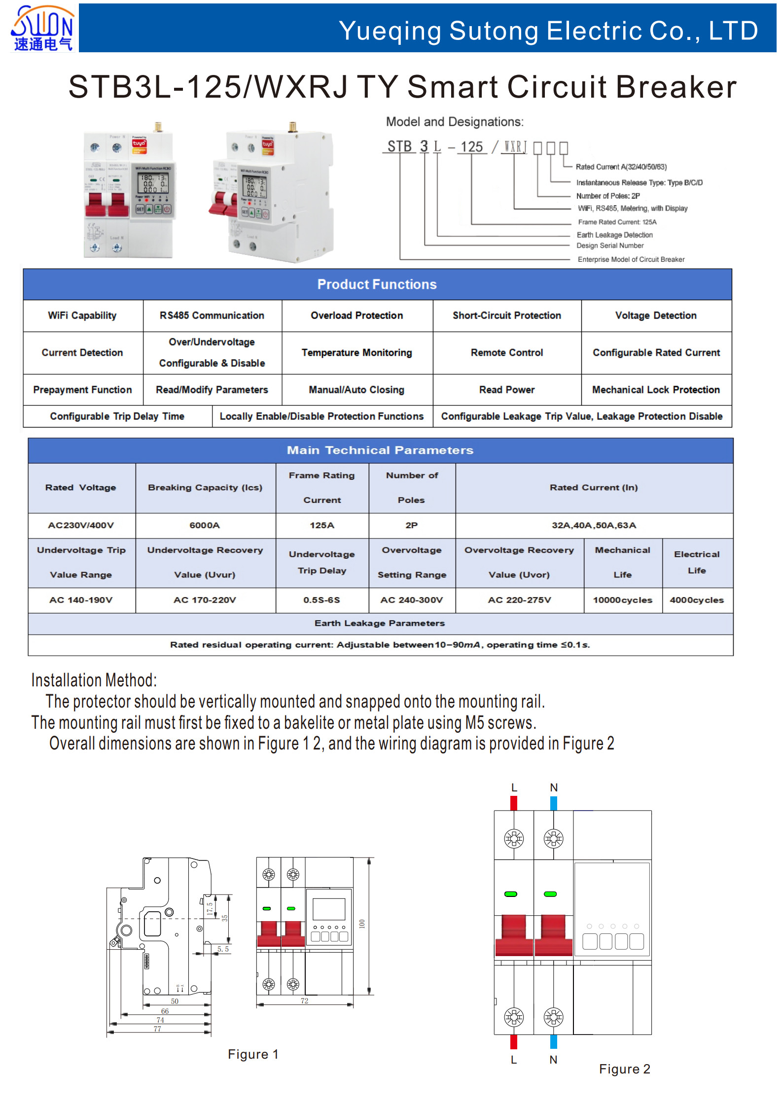 STBB3L-125/WXRJ系列智能断路器适用于交流 50Hz,额定工作电压230V/400V,额定工作电流63A及以下的用户或负载中,当线路中出现过载、短路及漏电时对用电设备及线路进行保护,外形美观、性能优良可靠,分断能力较高,脱扣迅速,可实现远程 控制,产品模数化导轨式安装。适用于工业控制设 备、大棚浇水、住宅小区、别墅、农业灌溉、养殖 场、抽水泵、出租房等。