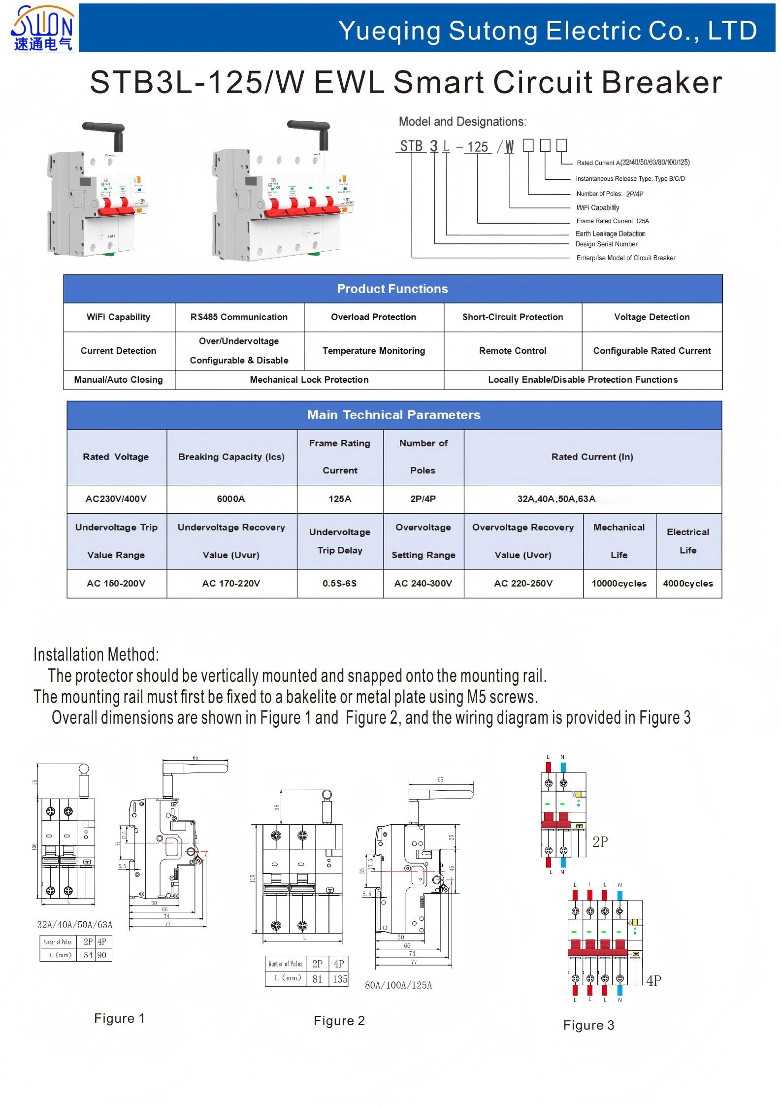STB3L-125W系列WiFi智能断路器联合易微联APP平台使用,适用于交流 50Hz,额定工作电压230V/400V,额定工作电流80A及以下的用户或负载中,当线路中出现过载、短路及 漏电时对用电设备及线路进行保护,外形美观、性 能优良可靠,分断能力较高,脱扣迅速,可实现远程 控制,产品模数化导轨式安装。适用于工业控制设 备、大棚浇水、住宅小区、别墅、农业灌溉、养殖 场、抽水泵、出租房等。