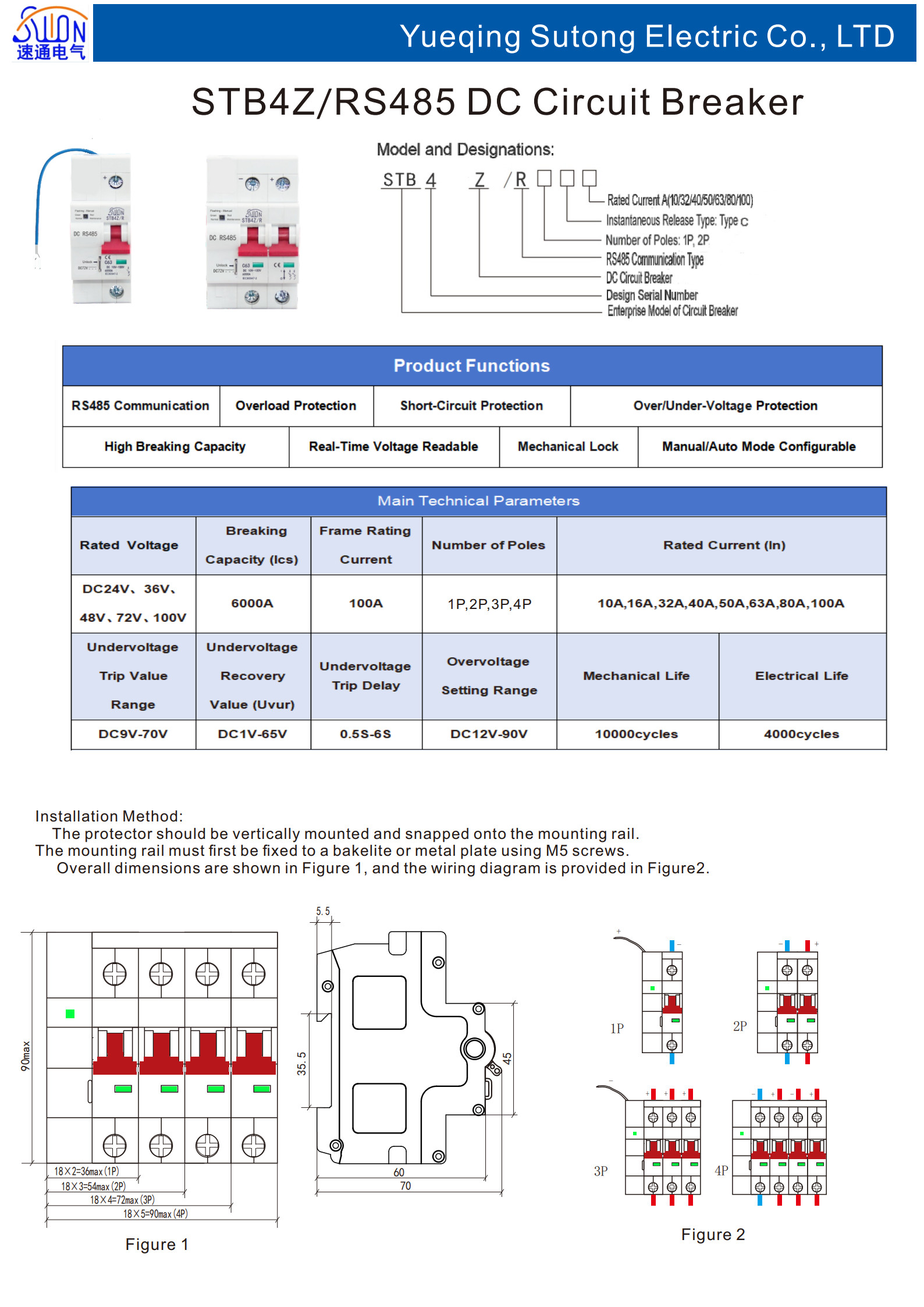 STB4Z系列RS485直流智能断路器适用于直流,额定 直流工作电压24V/36V/72V/100V,额定工作电流100A及 以下的用户或负载中,当线路中出现过欠压(设定过欠压) 时对用电设备进行保护;同时具有过载及短路保护功能, 外形美观、性能优良可靠,分断能力较高,脱扣迅速,可实现远程控制,产品模数化导轨式安装。