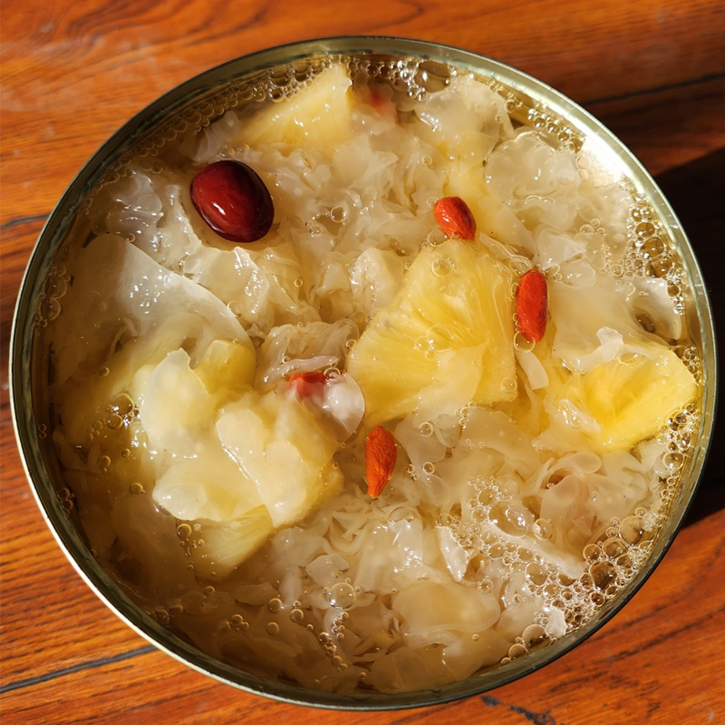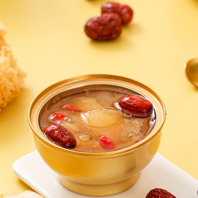 ● Это не только баночка вкусной еды, но и хороший рецепт для питания тела и ума. Белый древесный гриб богат пищевыми волокнами и желатином, который увлажняет кожу и придает ей сияние; красные финики хорошо восполняют ци и питают кровь, наполняя жизненной силой уставшую жизнь.