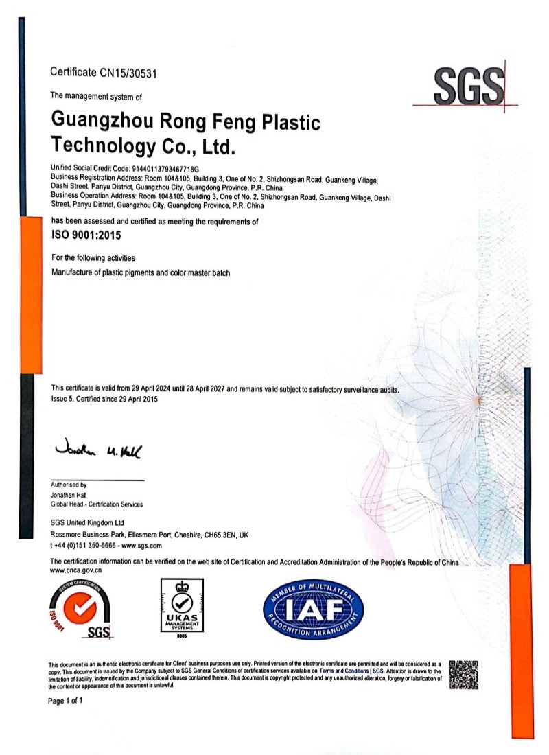 ООО Гуанчжоу Ронгфенг Пластмасс Технология была основана в 2006 году, имеет 18-летний опыт производства и головной офис в районе Панью, город Гуанчжоу, провинция Гуандун, Китай. Завод занимает площадь более 10 000 квадратных метров и имеет 30 производственных линий. Годовая производственная мощность нашей компании составляет около 10 000 тонн мастербатчей или красителей, и качество всегда на первом месте. Мы создали полную систему управления производством для контроля качества в соответствии со стандартами 19001. Rongfeng всегда уделяет большое внимание исследованиям и разработкам и может изготовить на заказ большинство цветов. Мы можем изготовить по индивидуальному заказу около 60 000 цветов различных материалов, таких как пп, пэ, абс, тпу, пк, пс, пвх, пла, пэтг, па, пет. …В настоящее время наша продукция широко используется в таких областях, как электротехника и электроника, канцелярские товары, предметы первой необходимости, повседневная упаковка, нетканые материалы, спортивная одежда, автозапчасти и т. д.