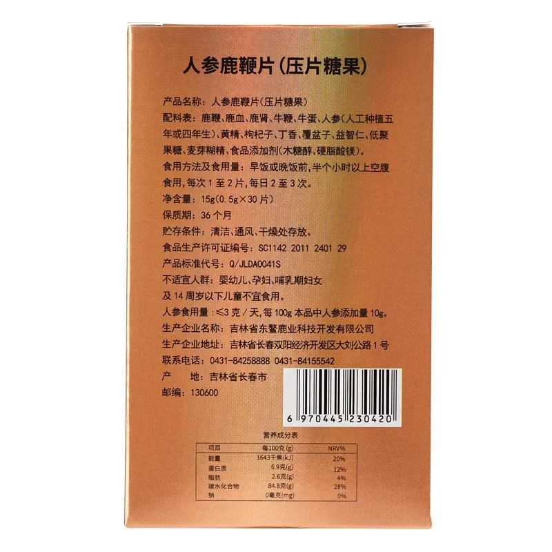Имеет свойство способствовать улучшению работы почек и усилению половой силы. (Таблетки женьшеня и пениса оленя Дунъао сочетают свойства лекарства и пищи, производятся из отборного пениса пятнистого оленя в сочетании с женьшенем с гор Чанбайшань и кровью пятнистого оленя, с добавлением почек оленя, пениса быка и гвоздики, а также других китайских трав, тщательно обработанных с применением современных биотехнологий. Основные лекарственные компоненты, такие как панты оленя, полностью расщепляются на малые молекулы для эффективного использования, максимально сохраняя активные компоненты, гарантия качества, вкус без рыбного привкуса и ощущения жирности, является превосходным оздоровительным продуктом для укрепления почек и улучшения физического состояния мужчин.