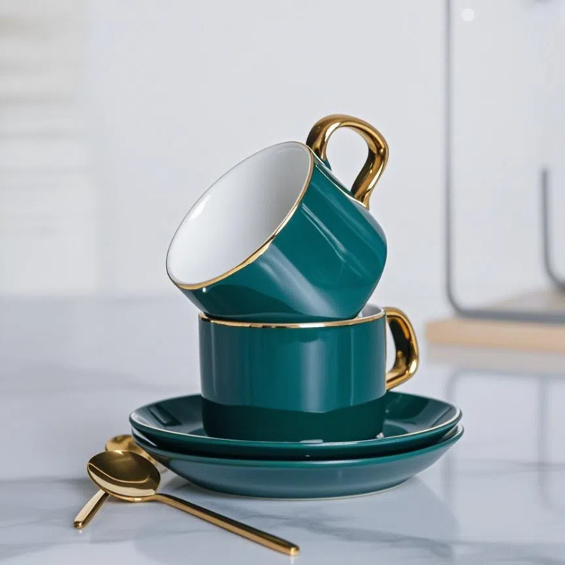 Стиль: Корпус чашки имеет классическую форму, с зеленой внешней стороной и золотым контуром, резким цветовым контрастом, простым и элегантным дизайном, не теряющим своей изысканности, и очень европейским легким роскошным стилем. В комплект входят чашки, блюдца и ложки того же цвета, и общая координация хорошая.
