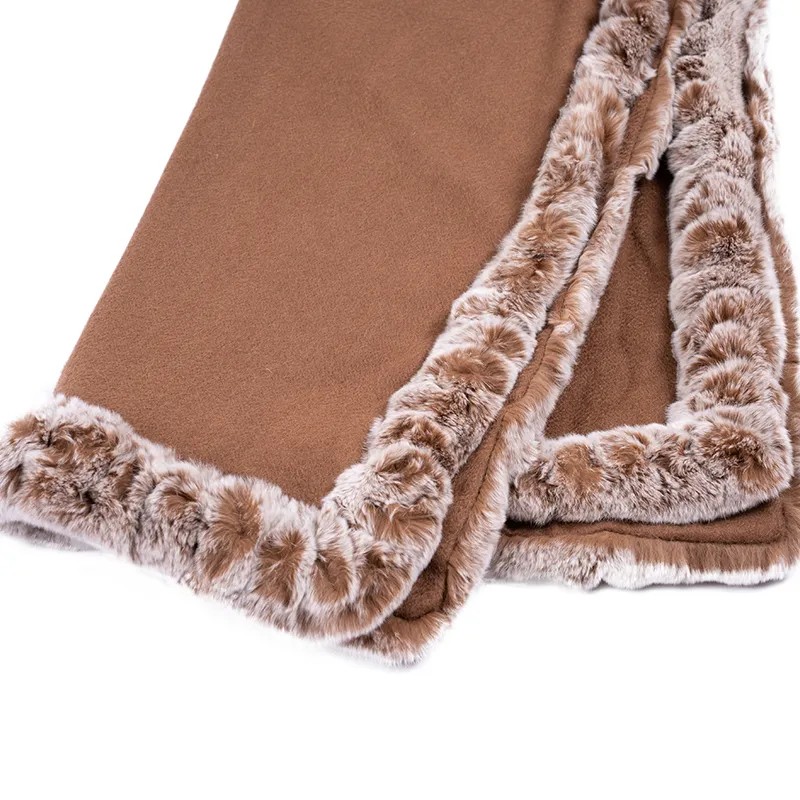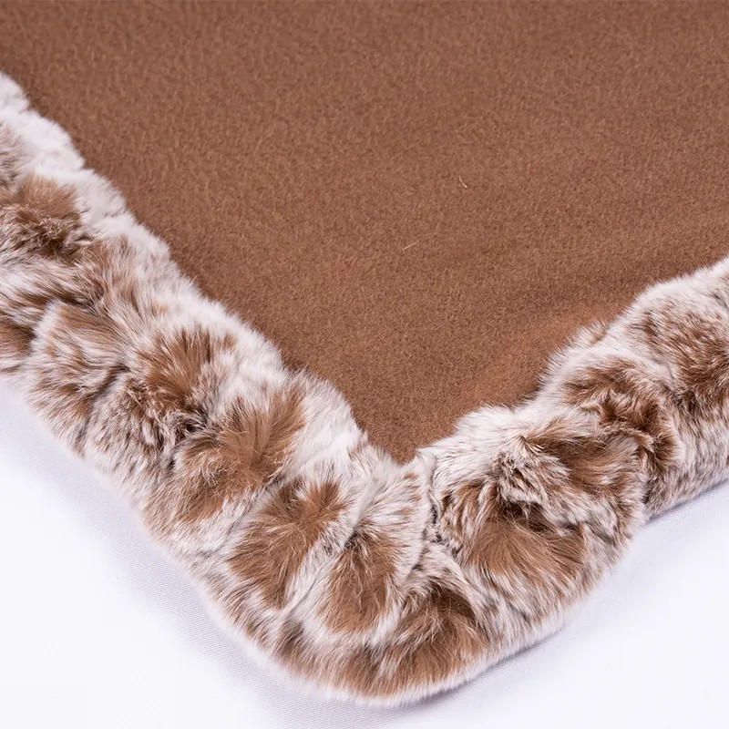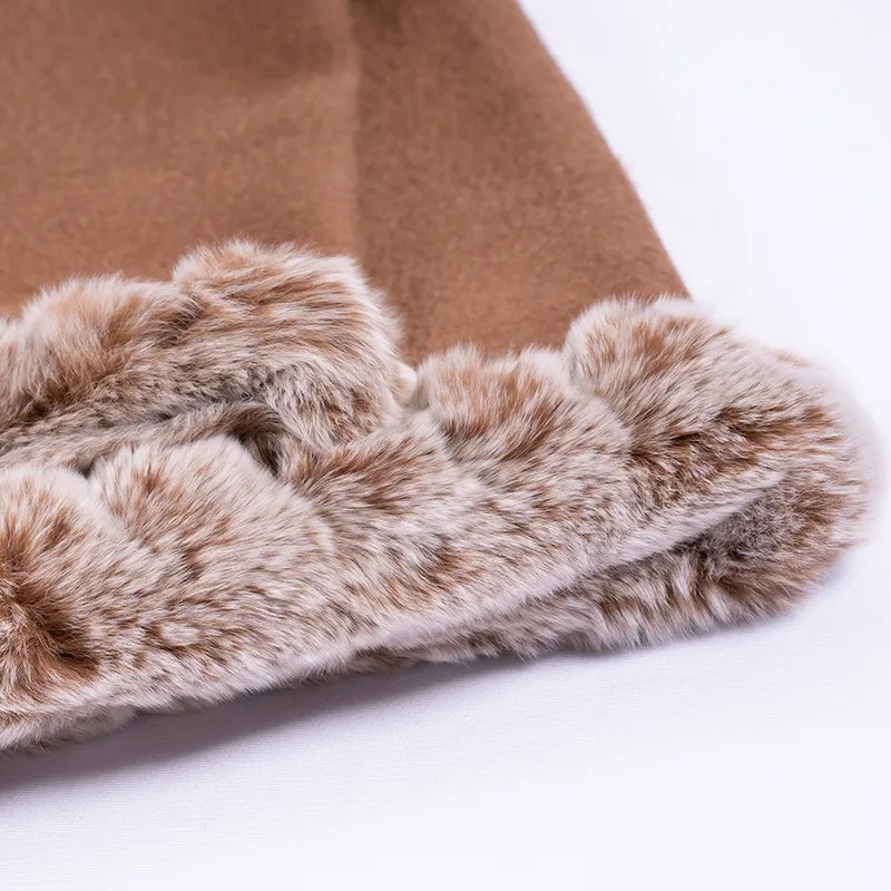 Края отделаны мехом кролика, текстура которого тонкая и плюшевая. Техника «шеарлинг», характеризующаяся градиентом коричневого и белого цветов, добавляет глубины, умело сочетая тепло кашемира с роскошной мягкостью кроличьего меха.