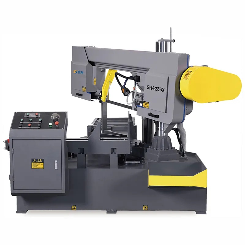 Угловой ленточнопильный станок модели GH4235X специально разработан для прямой и угловой резки профилей различных средних размеров. Конструкция с основной стойкой в сочетании с вспомогательной обеспечивает более стабильную резку; сквозной гидравлический цилиндр зажимает заготовку, что более удобно и быстро; пильная рама может качаться, образуя угол резки с заготовкой, и опускается в направлении позади зажимных тисков, предотвращая скатывание заготовки после ее резки.