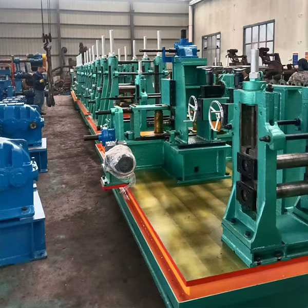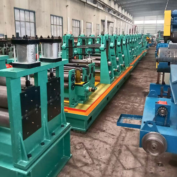 3. Устройство для формовки и сварки: включает в себя секцию формовки и секцию сварки. Секция формовки имеет несколько горизонтальных роликовых рам и вертикальных роликовых рам. Стальная полоса постепенно изгибается и формируется комбинированными роликами для формирования заготовки квадратной трубы. Сварочная часть обычно использует технологию высокочастотной сварки, используя высокочастотный ток для быстрого нагрева и расплавления краев заготовки трубы и сварки их вместе.