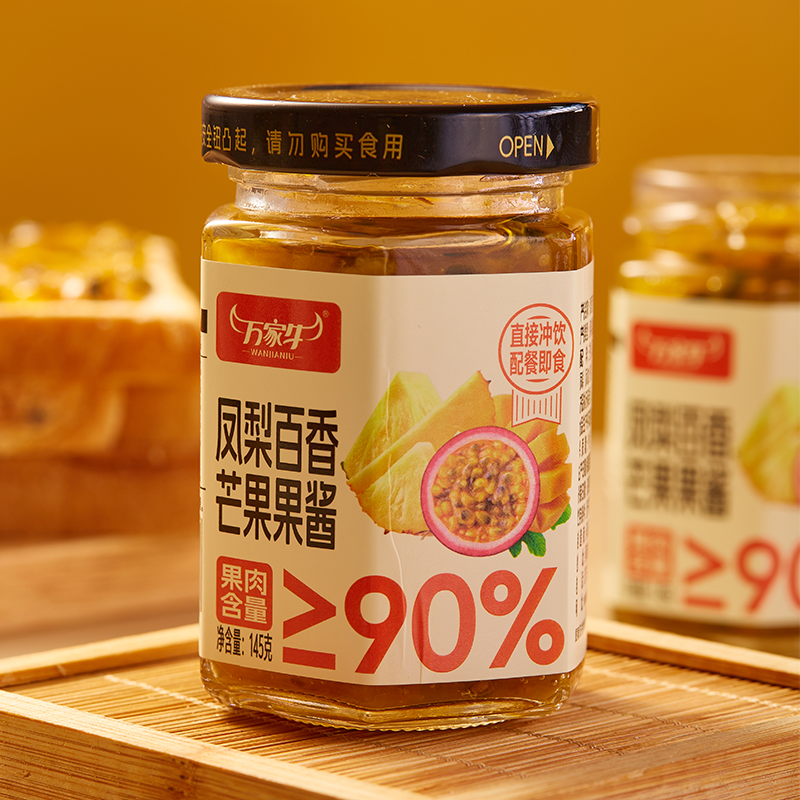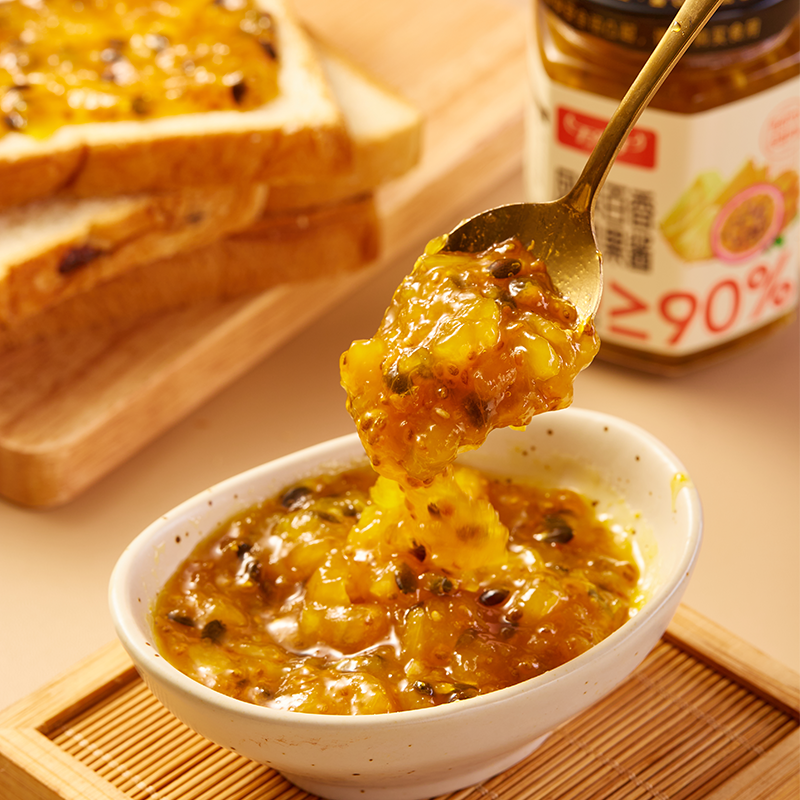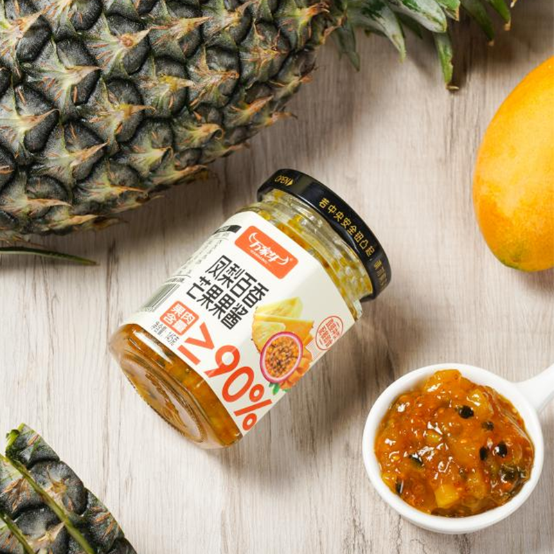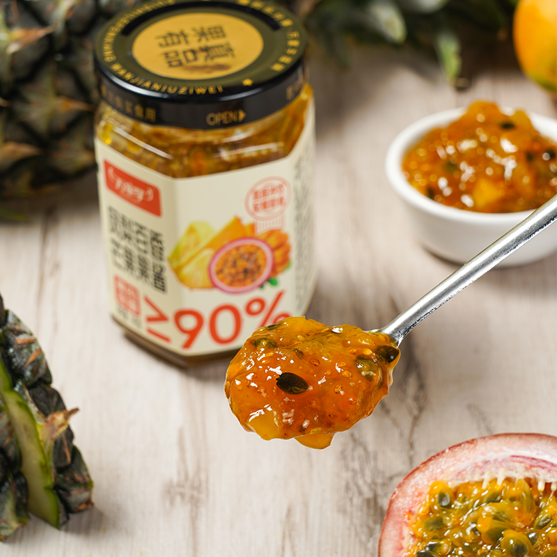 Состав: манго (добавка ≥45%), маракуйя (добавка ≥30%), ананас (добавка ≥15%), жёлтый сахар, семена чиа (добавка <4%)