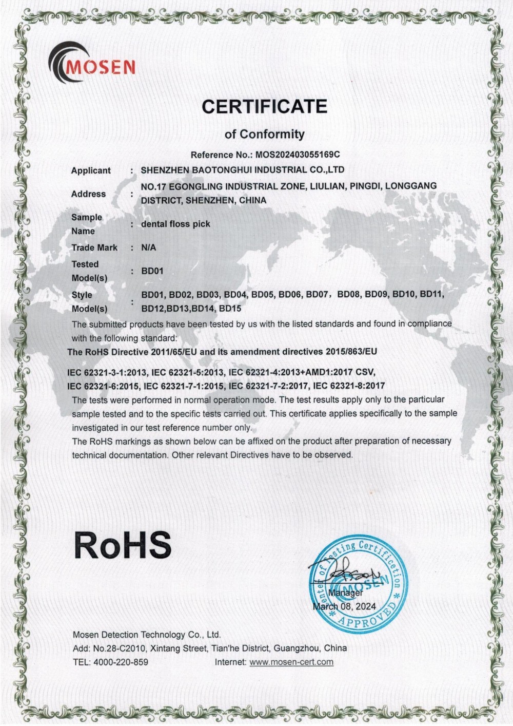 ISO 9001、ISO 13485、CE、RoHS、BSCI