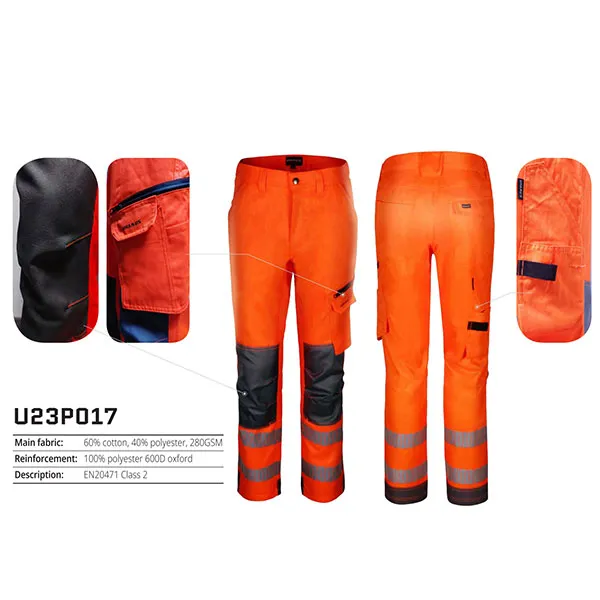 Рабочие брюки U23P017 с повышенной светоотражающей способностью, разработанные для обеспечения безопасности, долговечности и комфорта в сложных рабочих условиях. Основной материал, изготовленный из смеси 60% хлопка и 40% полиэстера плотностью 280 г/м², обеспечивает прочность и воздухопроницаемость, обеспечивая комфорт во время длительных смен и устойчив к ежедневному износу. Усиленные 100% полиэстером Оксфорд 600D, брюки обеспечивают исключительную устойчивость к истиранию в зонах интенсивного контакта, гарантируя их эффективность в сложных рабочих условиях.