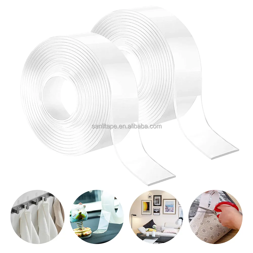 Нанолента изготовлена из акрилового клея, чувствительного к давлению, имеет прозрачный гелеобразный вид, высокую прозрачность, сильную адгезию и высокую эластичность. В ней используется передовая нанотехнология, обеспечивающая устойчивость к ультрафиолетовому излучению, химическую коррозионную стойкость (за исключением расплавленных щелочных металлов), высокую изоляцию и низкий коэффициент трения. Ее можно свободно резать по размеру и использовать для проектов «сделай сам». Она может заменить традиционные винты и заклепки, а ее клеевые свойства не повреждают поверхности. Эта прозрачная двусторонняя лента премиум-класса может быть вымыта и использована повторно десятки раз, не оставляя следов после удаления. Она особенно популярна для временных украшений или в условиях аренды.