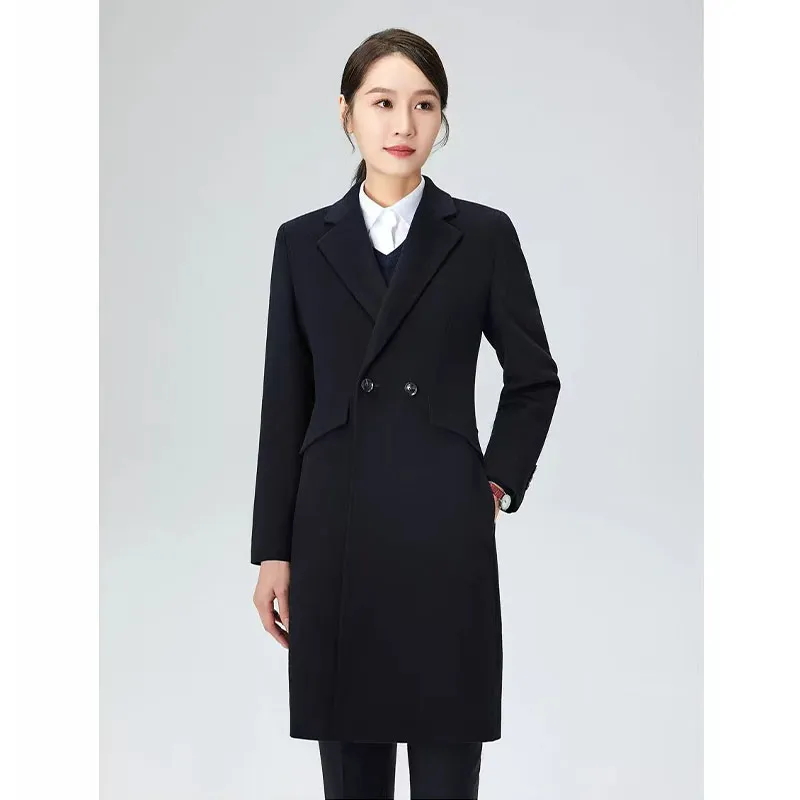 Пальто длиной примерно до колен, его плавные линии изящно повторяют контуры фигуры. Оно обеспечивает баланс между профессиональной сдержанностью, необходимой на рабочем месте, и комфортом повседневной носки. Цветовой контраст, созданный сочетанием с белой рубашкой, добавляет ярко выраженное ощущение многослойности. Вставные карманы ненавязчиво придают образу непринужденность, а детали двубортного кроя подчеркивают общую утонченность образа.