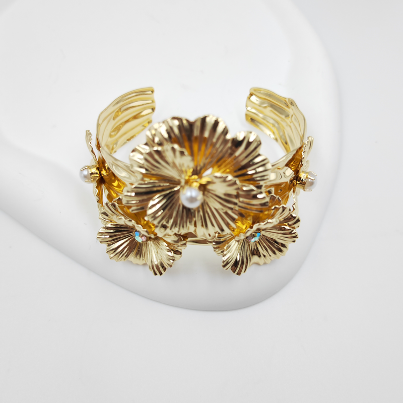 Это золотой браслет, выполненный из железа, с формой цветка в качестве изюминки дизайна, а центр цветка инкрустирован жемчугом, что в целом представляет собой нежный и великолепный легкий европейский и американский стиль.Его мастерство отличается изысканностью, металлическая текстура и тепло жемчуга контрастируют друг с другом, подходят для сочетания со всеми видами одежды, придавая элегантность общему образу.